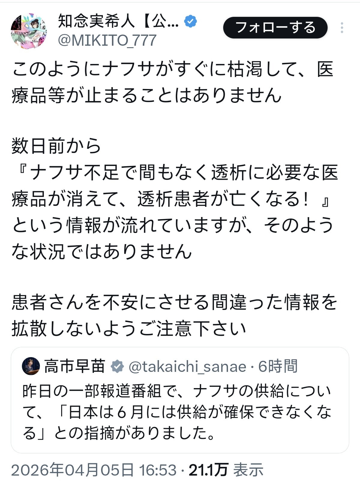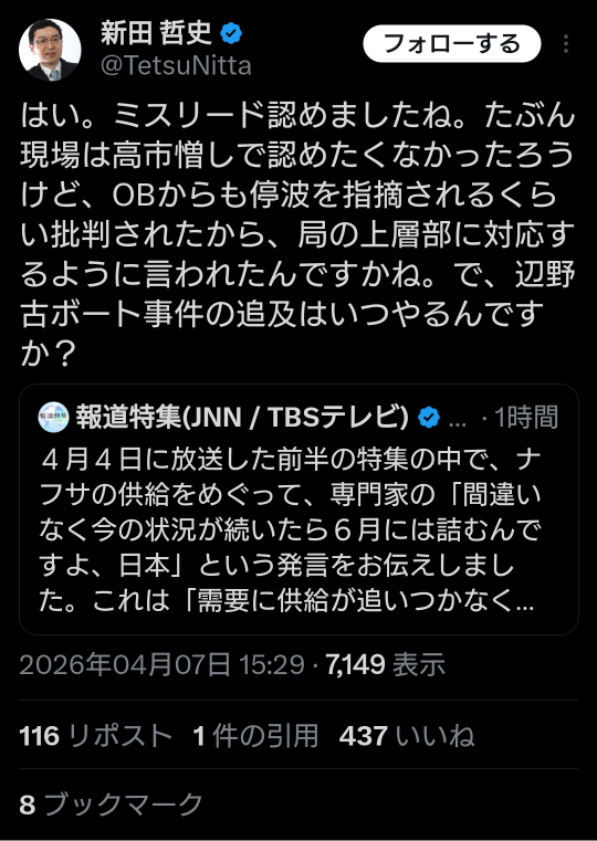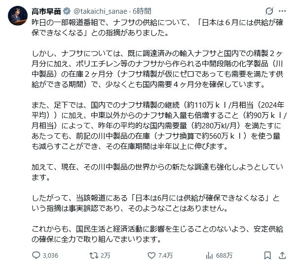 | … | 31無題Name名無し 26/04/05(日)20:01:13 IP:1.73.*(spmode.ne.jp)No.2712381そうだねx26 1775386873637.png-(62677 B) 高市さんからナフサ報道についてだよ |
