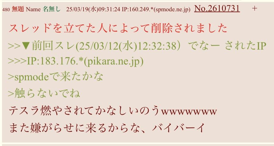 | … | 602無題Name名無し 26/04/08(水)22:18:59 IP:27.137.*(home.ne.jp)No.2713178+>前に擬態荒らしが捲れた奴っぽいの居ると変な単発が増えるな |