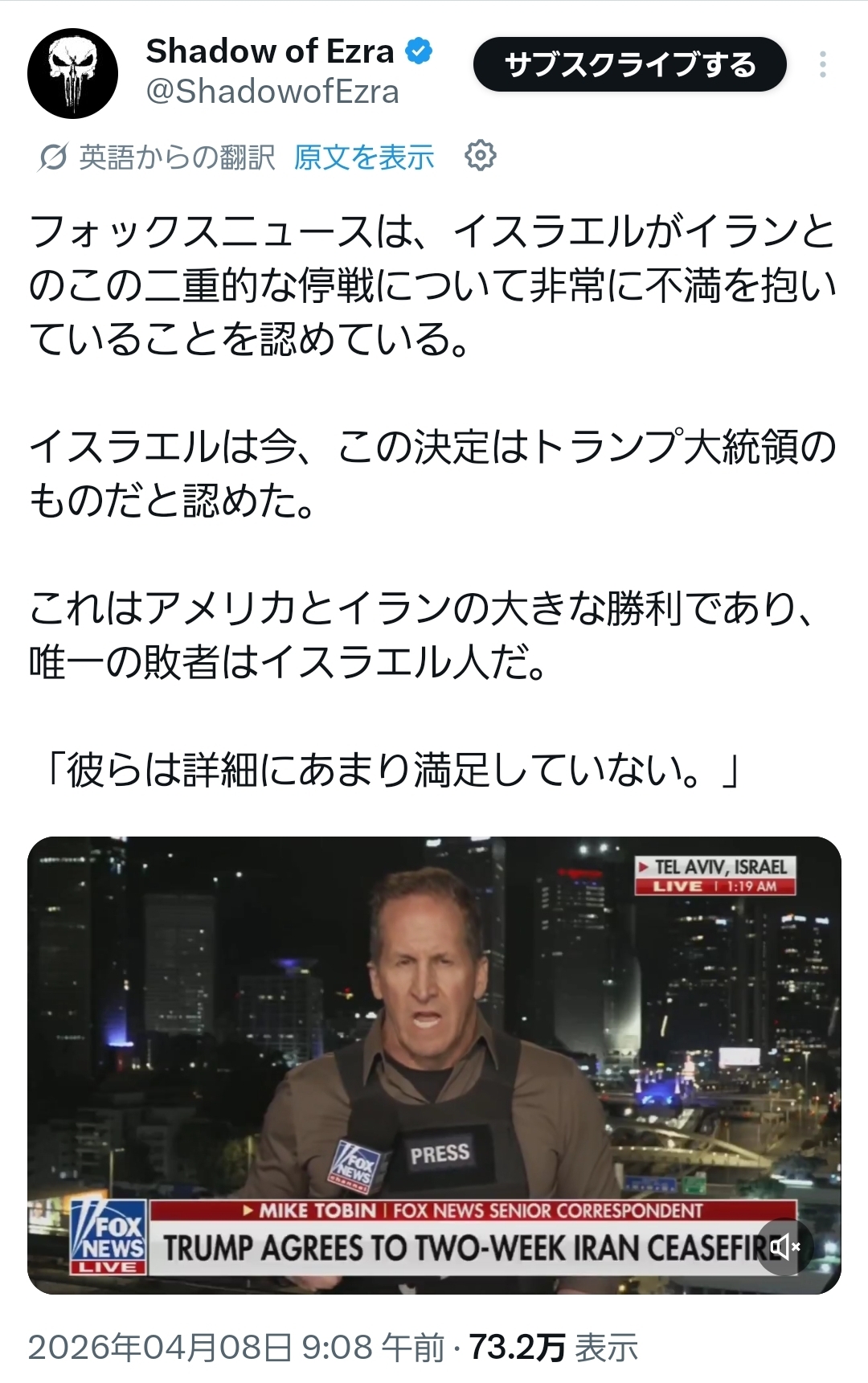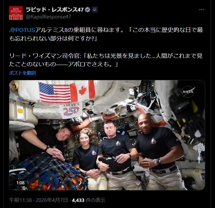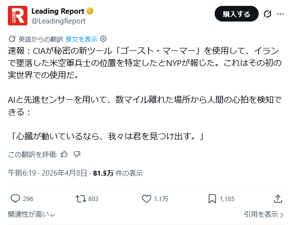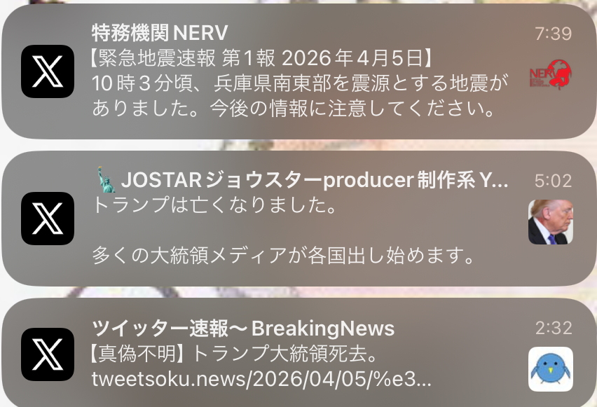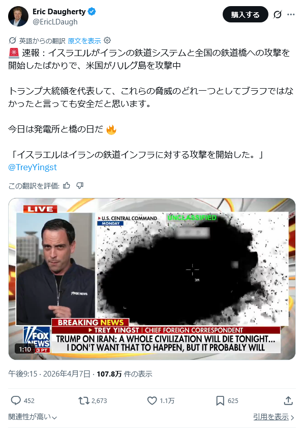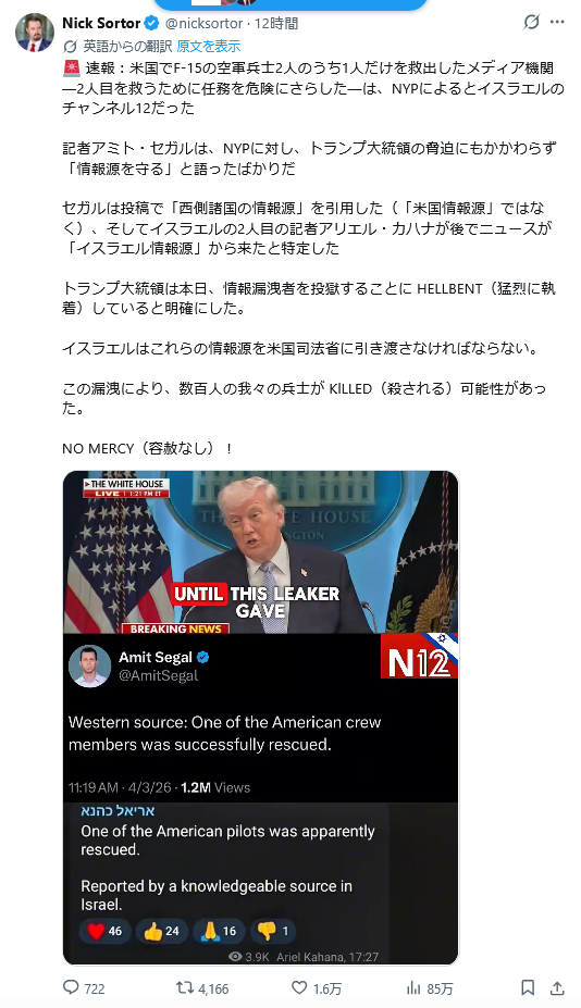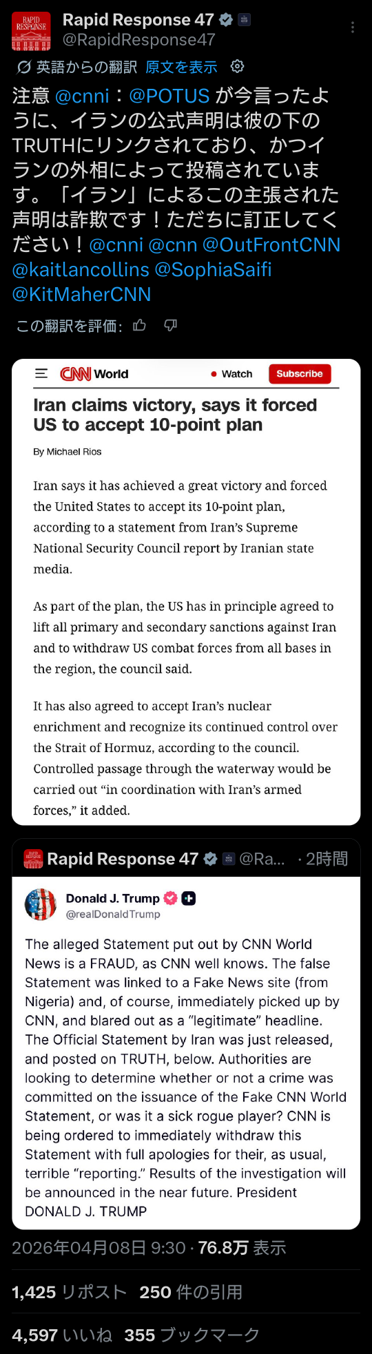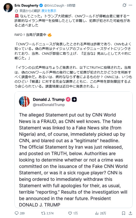 | … | 541無題Name名無し 26/04/08(水)18:53:03 IP:160.249.*(spmode.ne.jp)No.2713114そうだねx1>どうもこれCNNワールドニュースが報じたフェイクニュースらしい |