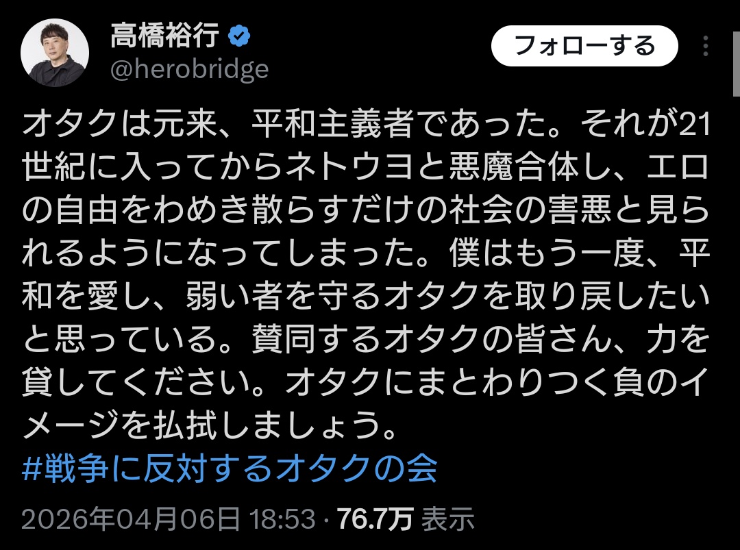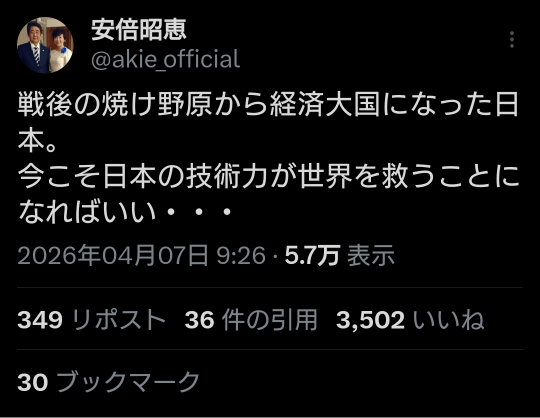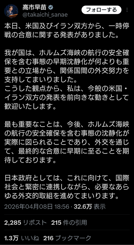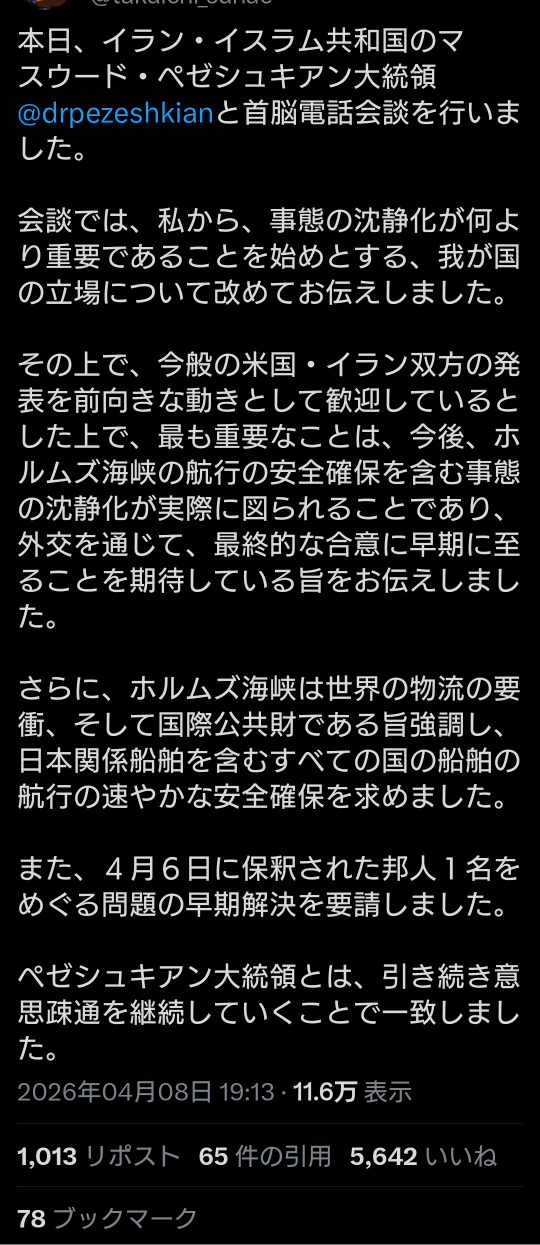 | … | 581無題Name名無し 26/04/08(水)20:37:50 IP:160.249.*(spmode.ne.jp)No.2713157そうだねx6>https://x.com/takaichi_sanae/status/2041817517816213634 |