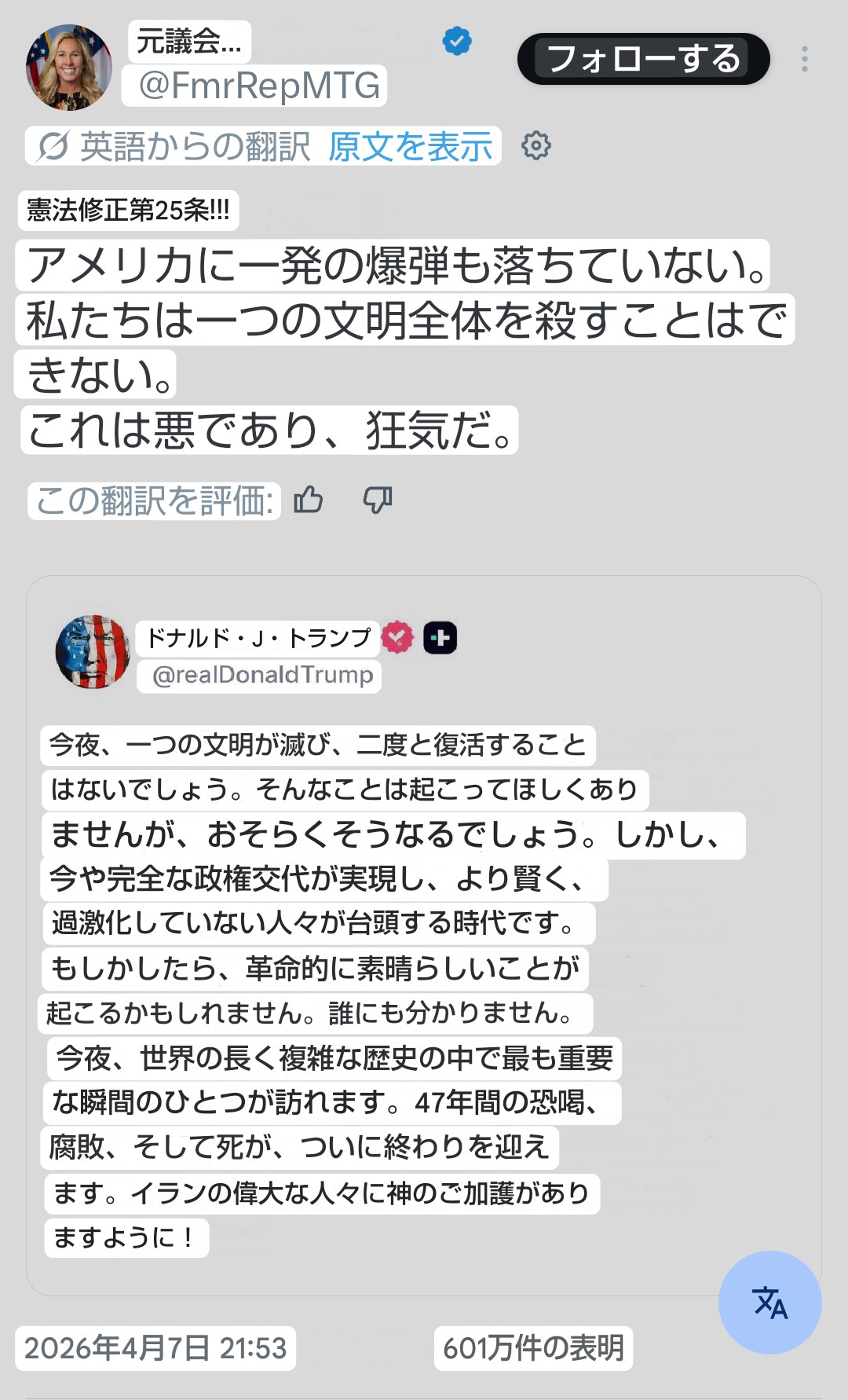 | … | 574無題Name名無し 26/04/08(水)19:45:11 IP:59.132.*(au-net.ne.jp)No.2713148そうだねx2 1775645111560.png-(281044 B) >https://x.com/takaichi_sanae/status/2041817517816213634 |