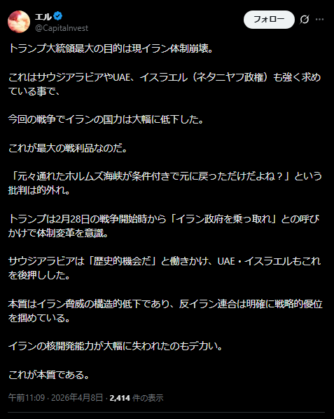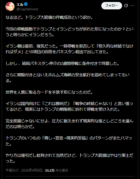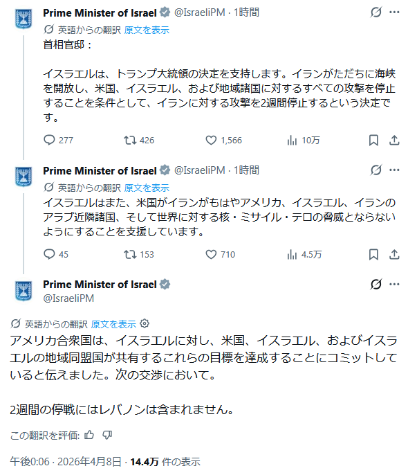 | … | 636無題Name名無し 26/04/09(木)08:07:57 IP:61.118.*(ocn.ne.jp)No.2713228+>今回の停戦で文句言ってるのはイラン革命防衛隊とかいうイスラム革命でイラン乗っ取った連中とイスラエルだけだし止まりたくないなら勝手にやれってなるし |