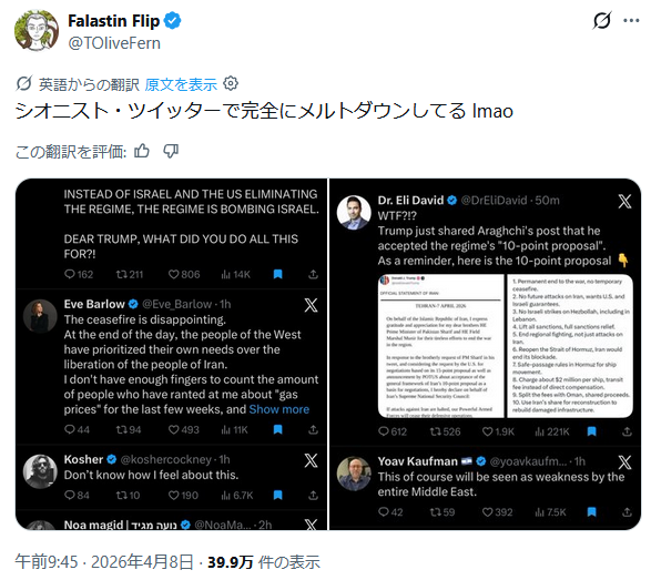 | … | 554無題Name名無し 26/04/08(水)19:11:04 IP:106.150.*(dion.ne.jp)No.2713127そうだねx1 1775643064685.png-(862185 B) >イスラエルはイスラエルだからね |