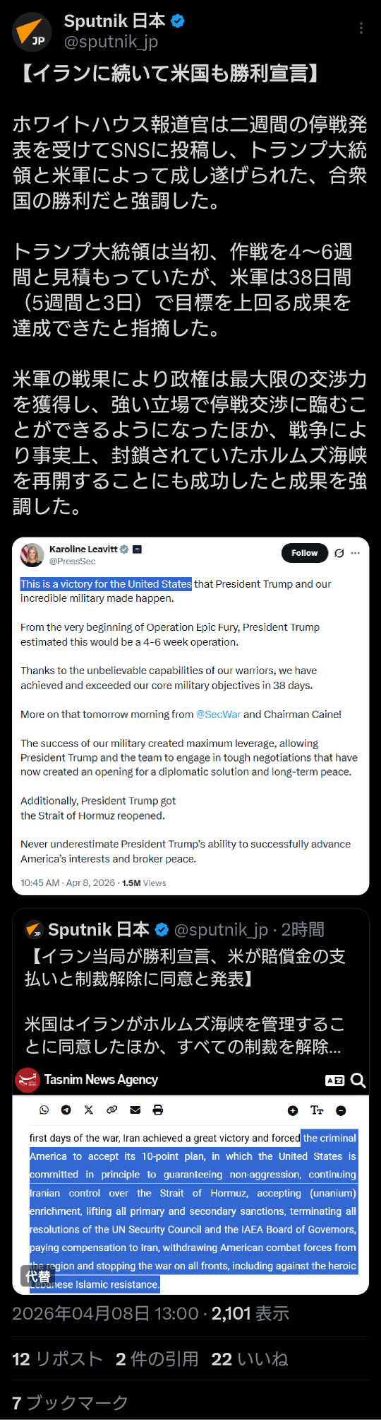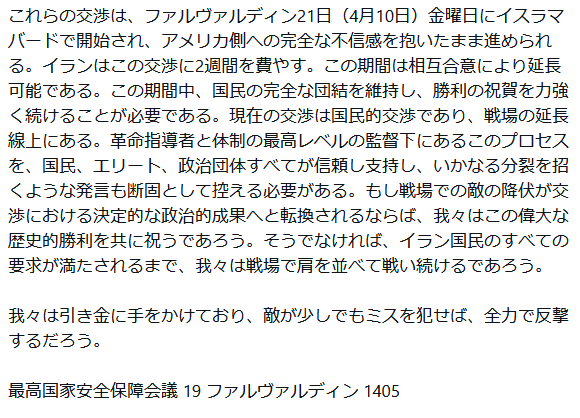 | … | 550無題Name名無し 26/04/08(水)19:04:39 IP:153.212.*(ocn.ne.jp)No.2713123そうだねx1 1775642679720.png-(123316 B) >>ファルス通信が報道した国家安全保障最高会議の声明 |