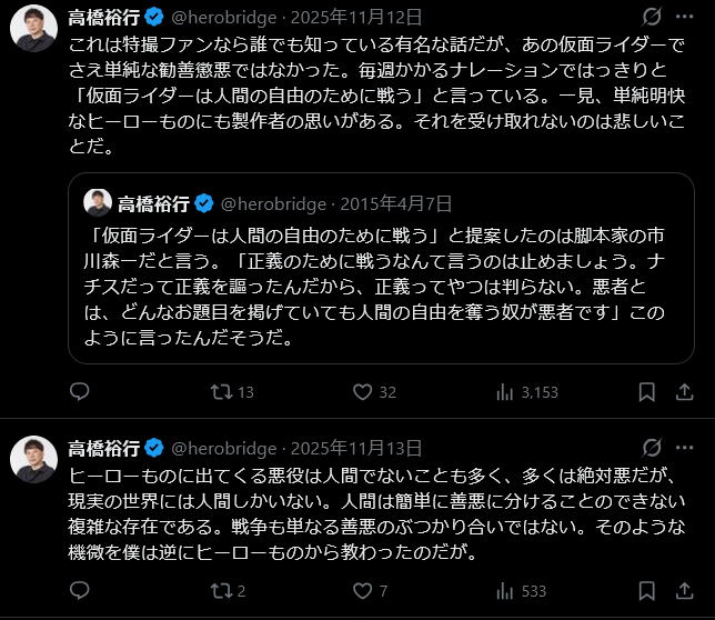 | … | 548無題Name名無し 26/04/08(水)19:03:42 IP:153.232.*(dti.ne.jp)No.2713121そうだねx10>本人は特撮ファンでガンダムには無関心なんだろ |