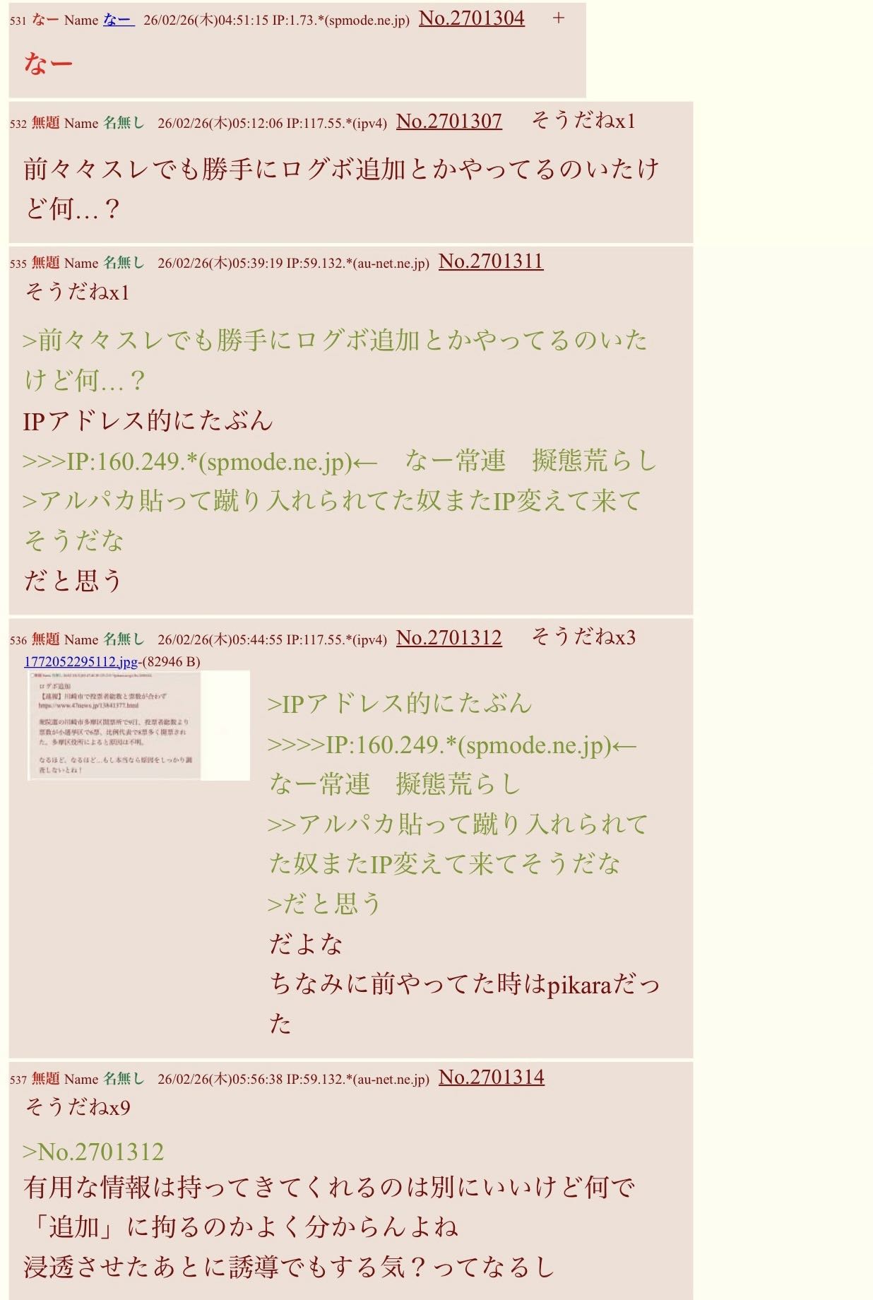 | … | 310無題Name名無し 26/04/19(日)21:52:22 IP:59.132.*(au-net.ne.jp)No.2715630そうだねx3>そして今一部で話題になってる依頼キャンセルや詐欺問題で偽旗が炙り出されてるような感じがしたね |