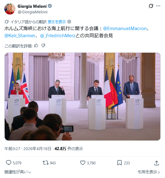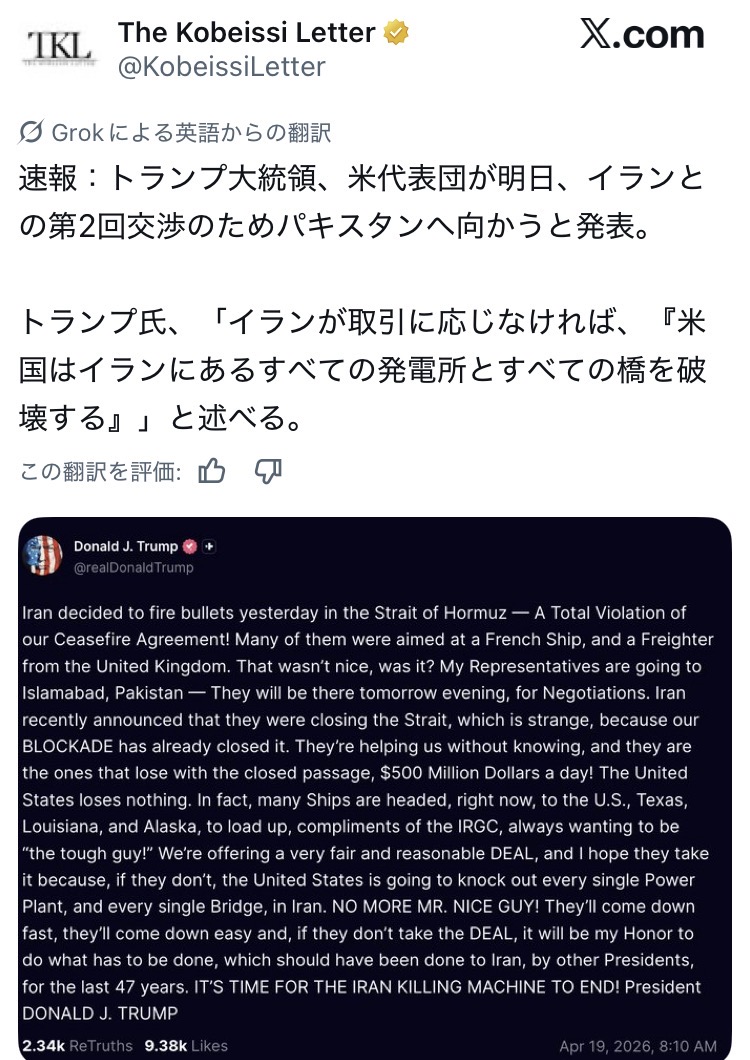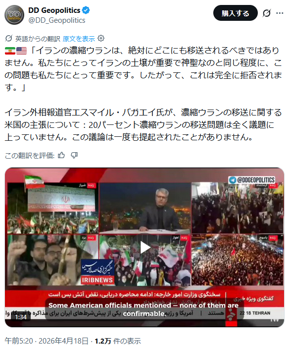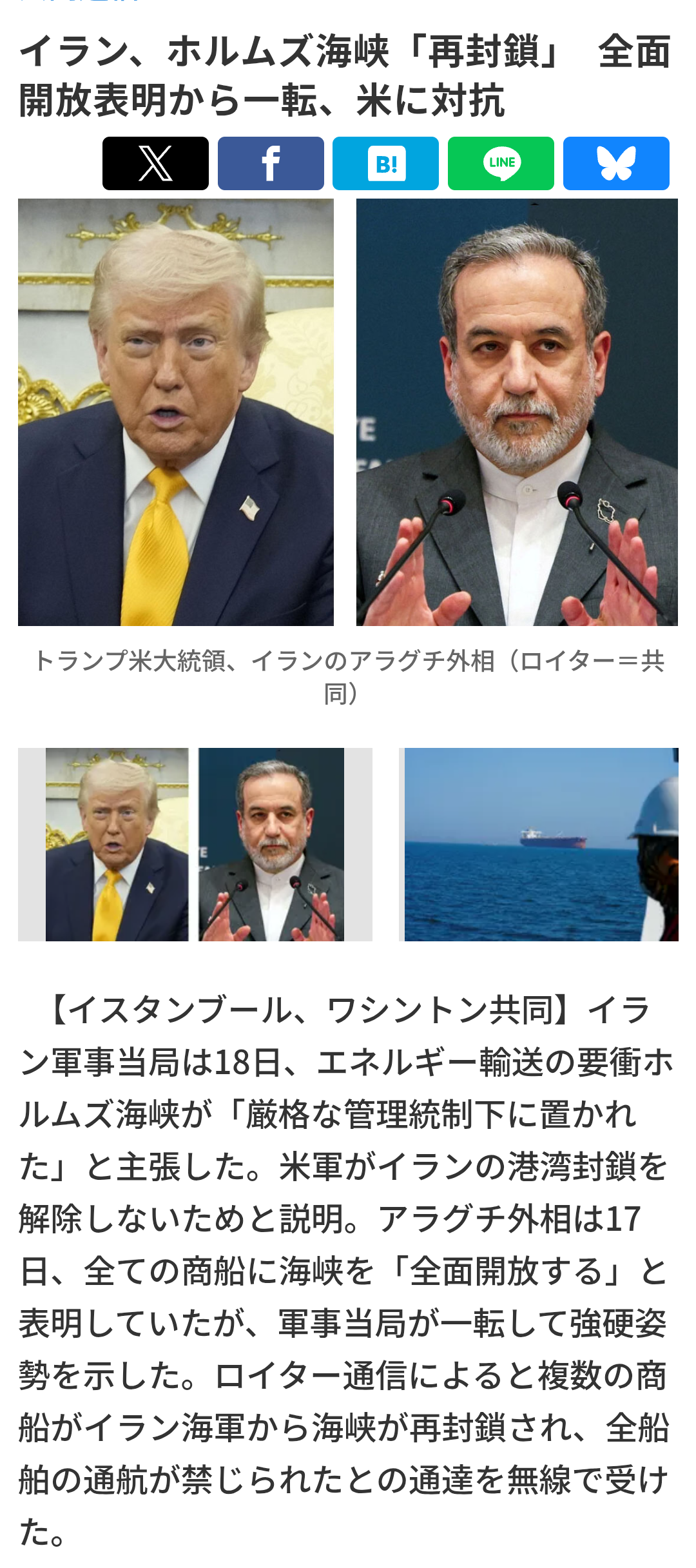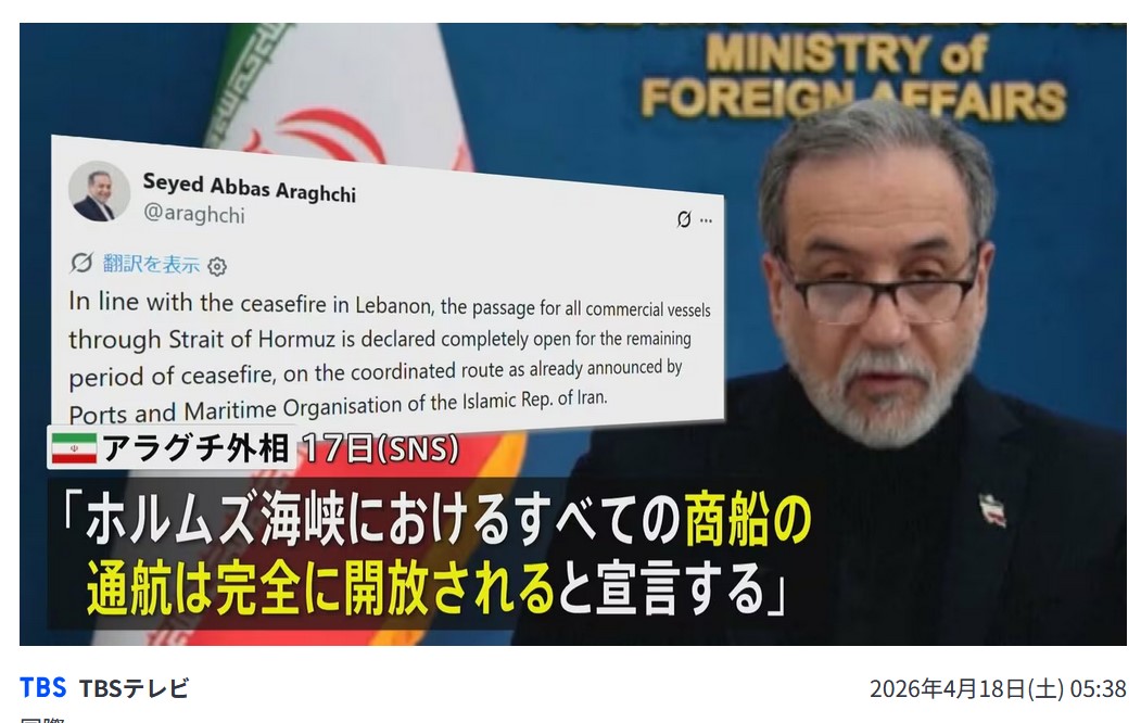 | … | 40無題Name名無し 26/04/18(土)05:45:00 IP:106.150.*(dion.ne.jp)No.2715318+ 1776458700836.jpg-(143215 B) ホルムズ海峡「停戦期間中は開放」イラン外相がSNS投稿 19日にも米・イラン2回目の協議か(抜粋) |