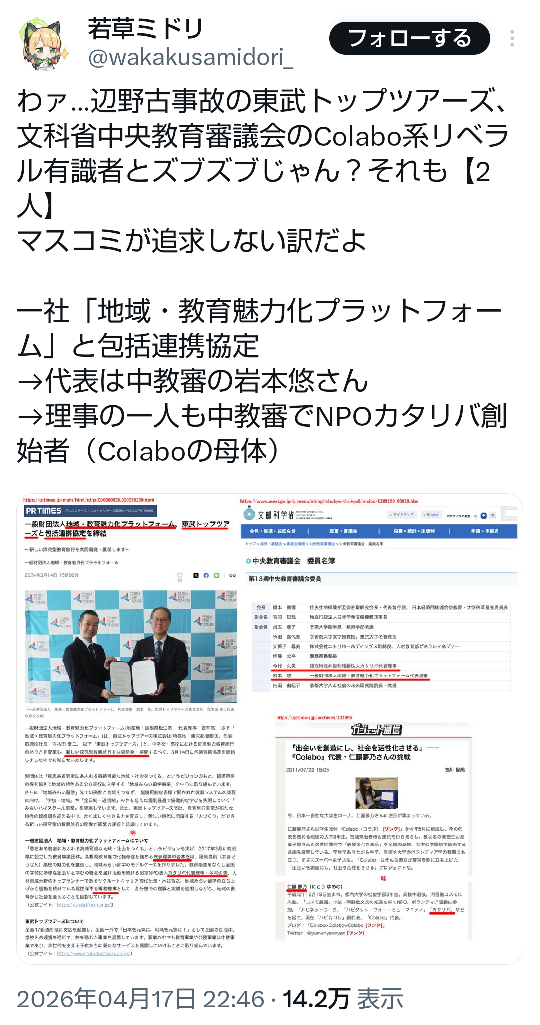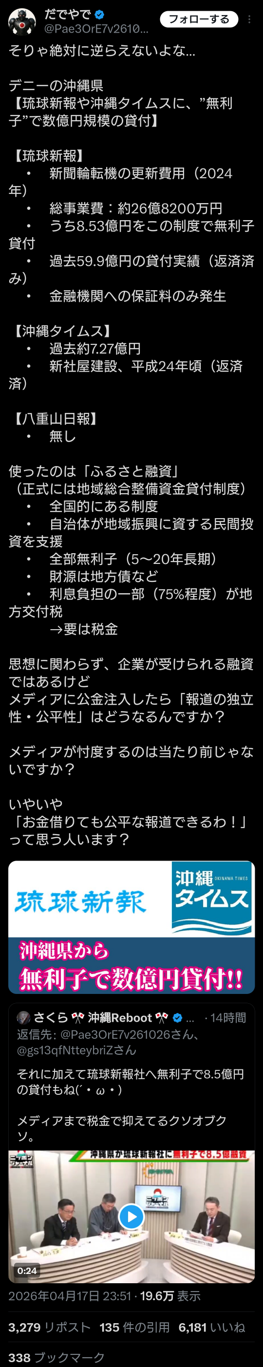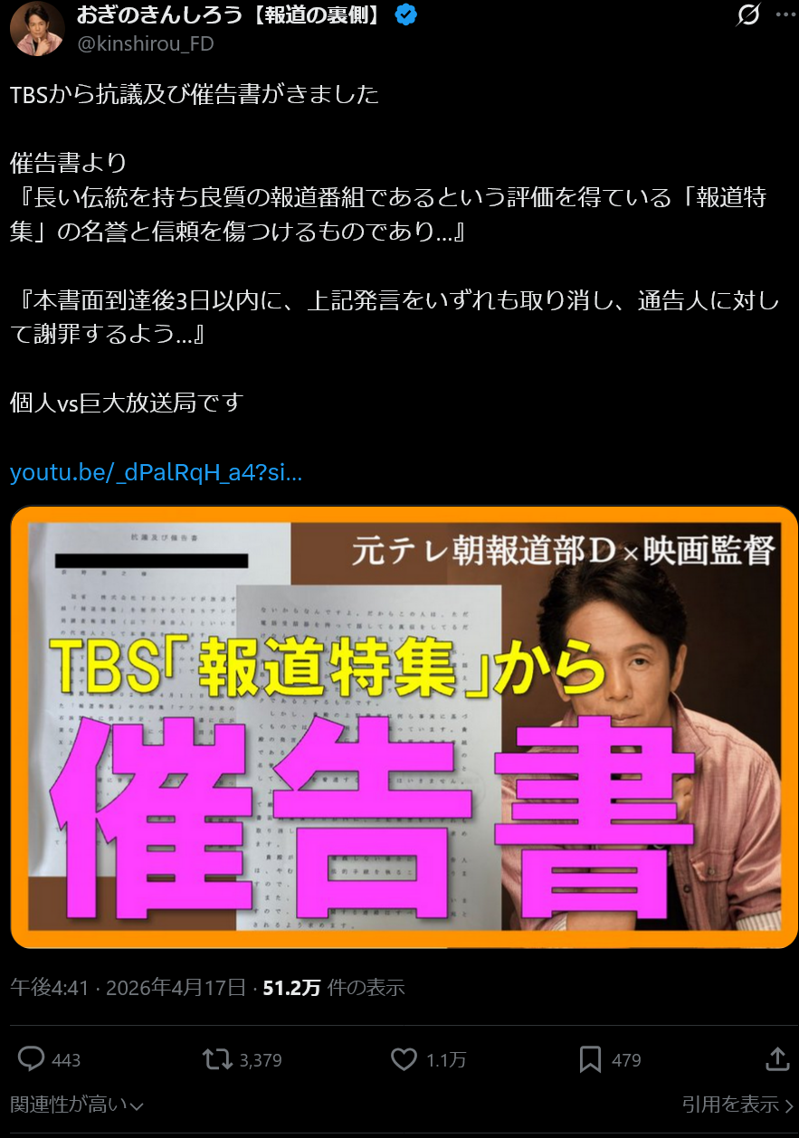 | … | 79無題Name名無し 26/04/18(土)12:17:41 IP:126.126.*(bbtec.net)No.2715365そうだねx1 1776482261734.png-(77018 B) >おぎのきんしろう【報道の裏側】@kinshirou_FD |