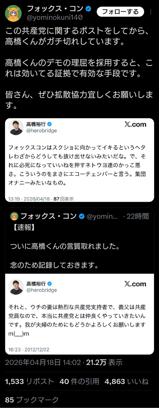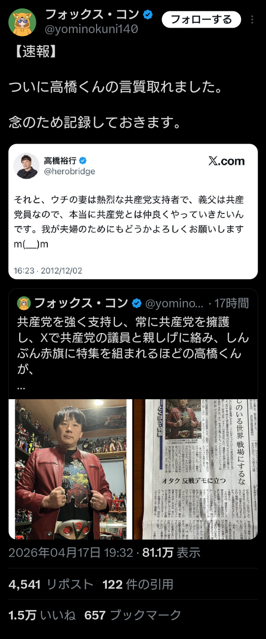 | … | 83無題Name名無し 26/04/18(土)12:55:55 IP:182.249.*(au-net.ne.jp)No.2715370そうだねx19 1776484555204.png-(517045 B) https://x.com/yominokuni140/status/2045087884173271375 |