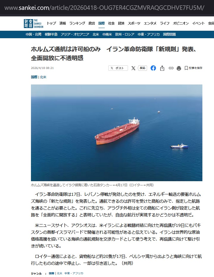 | … | 73無題Name名無し 26/04/18(土)11:38:52 IP:106.150.*(dion.ne.jp)No.2715357+ 1776479932571.jpg-(110768 B) >ホルムズ通航は許可船のみ イラン「新規則」発表 |