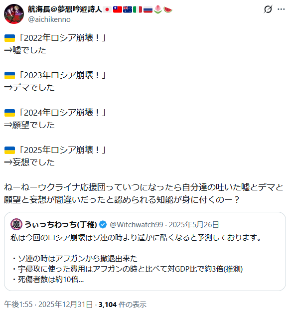 | … | 246無題Name名無し 26/04/19(日)14:58:44 IP:153.212.*(ocn.ne.jp)No.2715560+ 1776578324427.png-(93005 B) >うぃっちわっち(丁稚)はウクライナ応援団の有名人だよ |