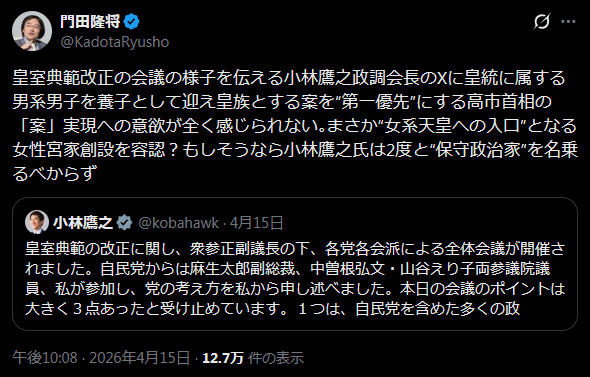 | … | 294無題Name名無し 26/04/19(日)18:46:14 IP:125.193.*(mesh.ad.jp)No.2715610そうだねx5小林鷹之の女性宮家いいよね…発言で |
