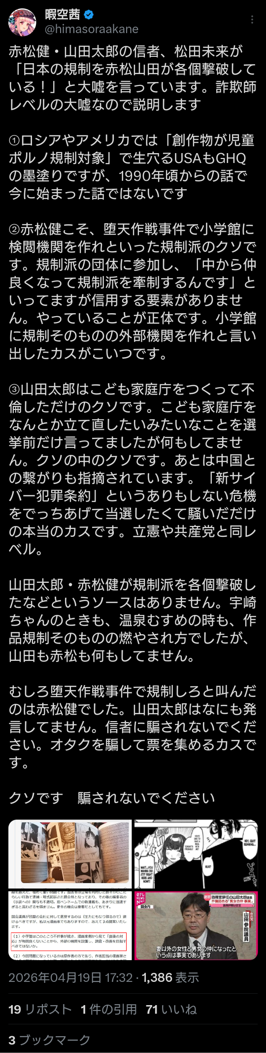 | … | 305無題Name名無し 26/04/19(日)21:40:28 IP:211.15.*(dion.ne.jp)No.2715625そうだねx11>https://x.com/himasoraakane/status/2045782458701086732 |