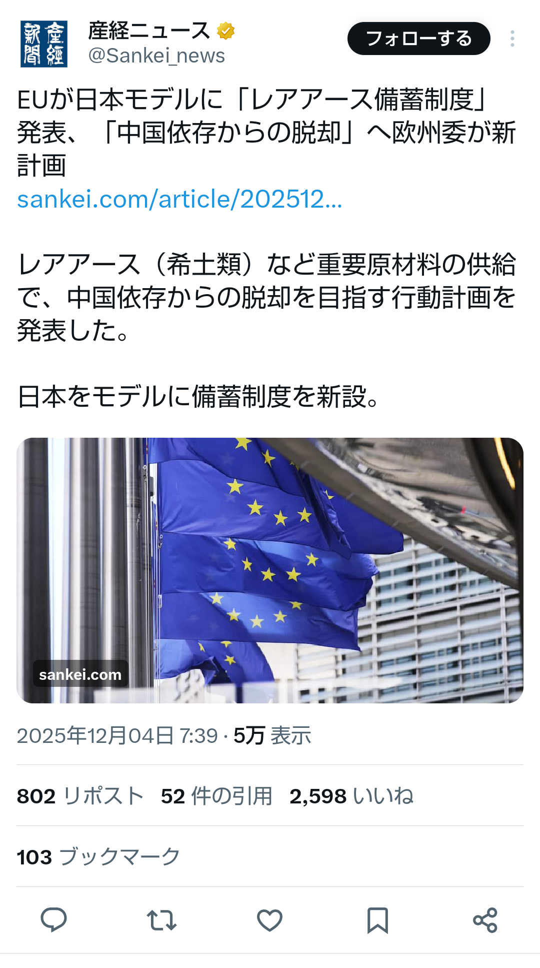 | … | 193無題Name名無し 25/12/04(木)11:19:48No.763609+ 1764814788484.png-(804707 B) >EUが日本モデルに「レアアース備蓄制度」発表、「中国依存からの脱却」へ欧州委が新計画 |