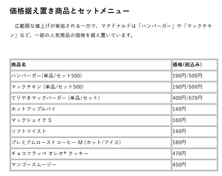 対象となる商品は、「ダブルチーズバーガー(単品)」が450円から480円。「ダブルチーズバーガー(セット)」が700円から740円。「マックフライポテト」Sサイズが200円から220円など。すべて税込み。なお「マックチキン」やハンバーガーなどの価格は据え置き。