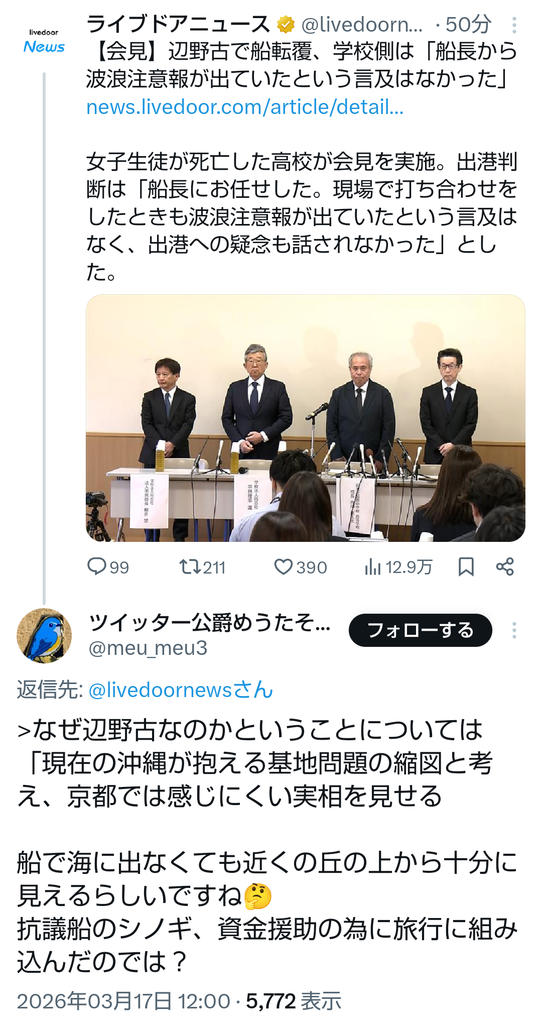 | … | 970無題Name名無し 26/03/17(火)12:52:10No.787538+ 1773719530248.png-(744017 B) >研修旅行中に生徒1人死亡 同志社国際高校が会見で謝罪「2015年ころから辺野古へ」沖縄へは創立当時から40年以上(FNNプライムオンライン) |