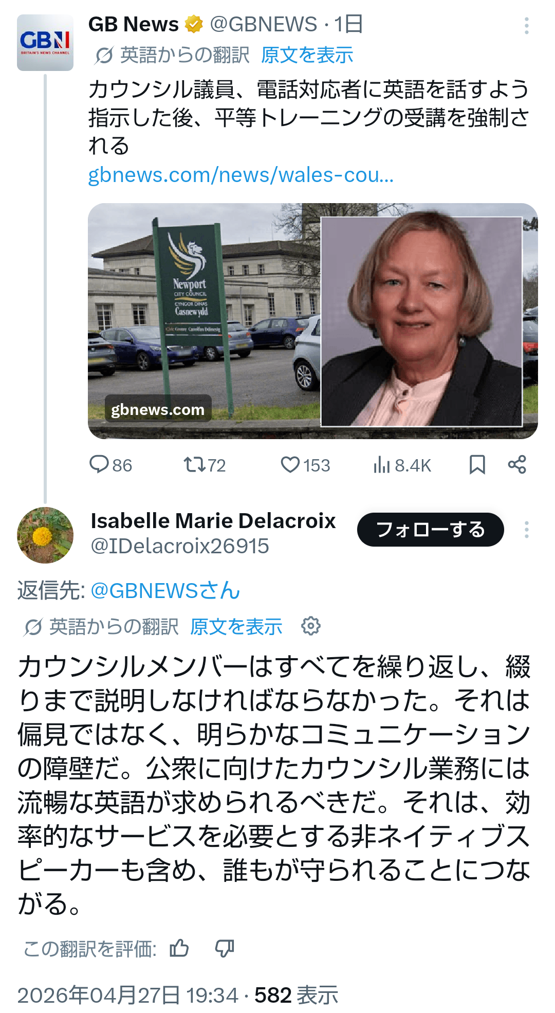 | … | 455無題Name名無し 26/04/28(火)17:51:36No.794425+ 1777366296748.png-(722108 B) >カウンシル議員、電話対応者に英語を話すよう指示した後、平等トレーニングの受講を強制される |