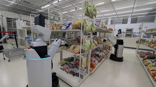 この実証実験では、別の場所にいるロボットを未来館から操縦して、在庫の確認、商品の移動、