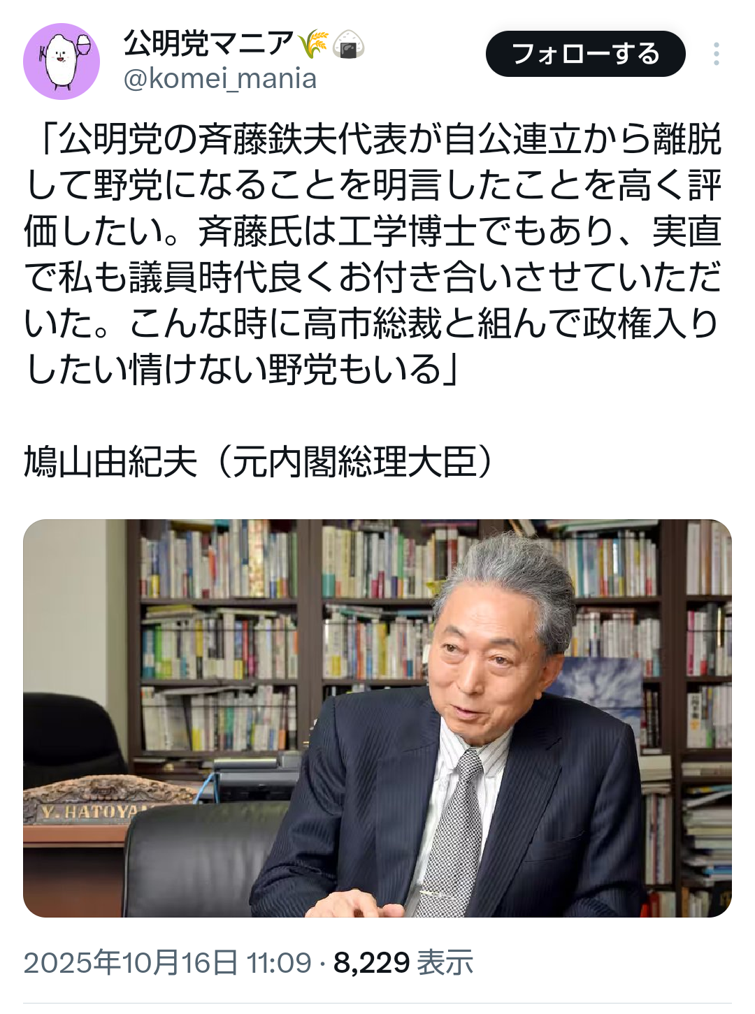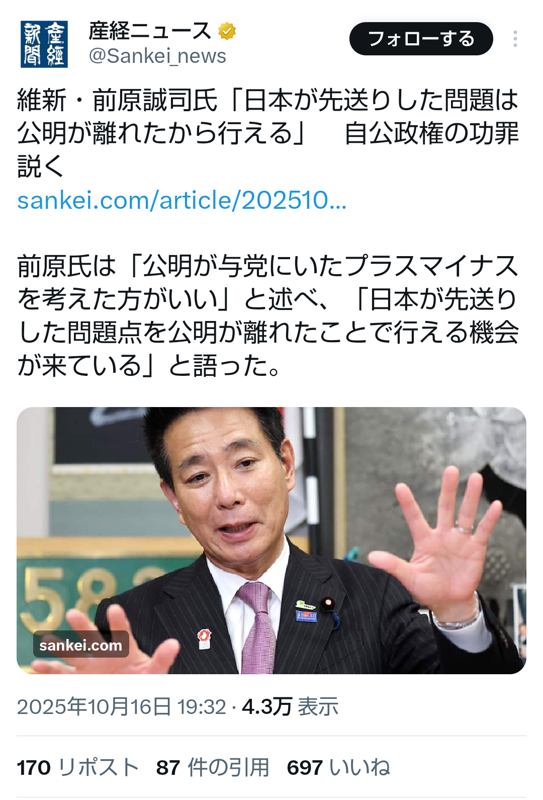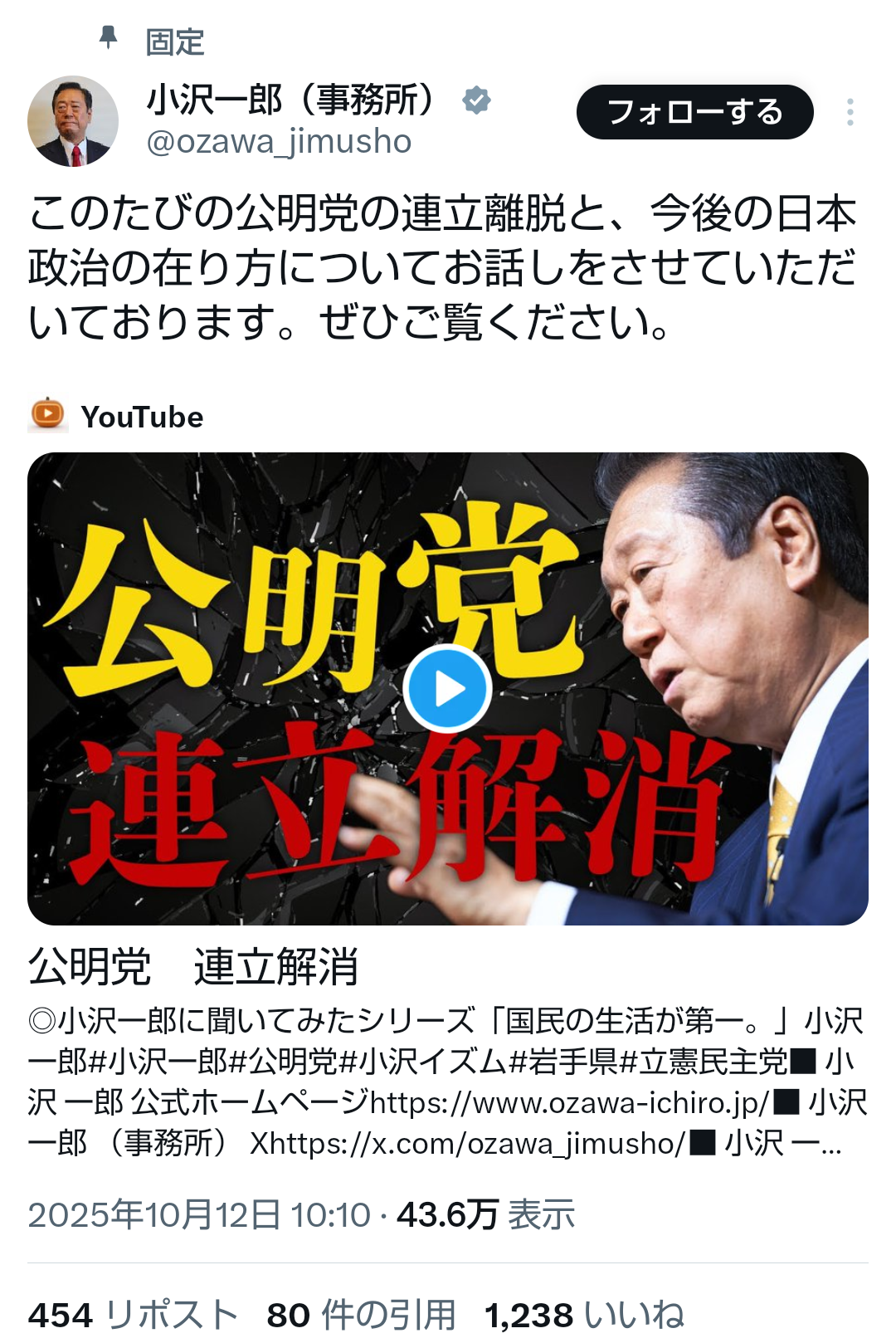 … | 11無題Name名無し 25/10/15(水)17:23:59No.753093+ 1760516639809.png-(1038776 B) ![]() >小沢一郎氏、公明離脱の本当の理由は「高市総裁の『考え方・発想・体質』そのものへの拒否感」 |