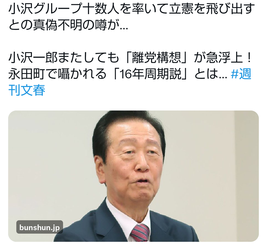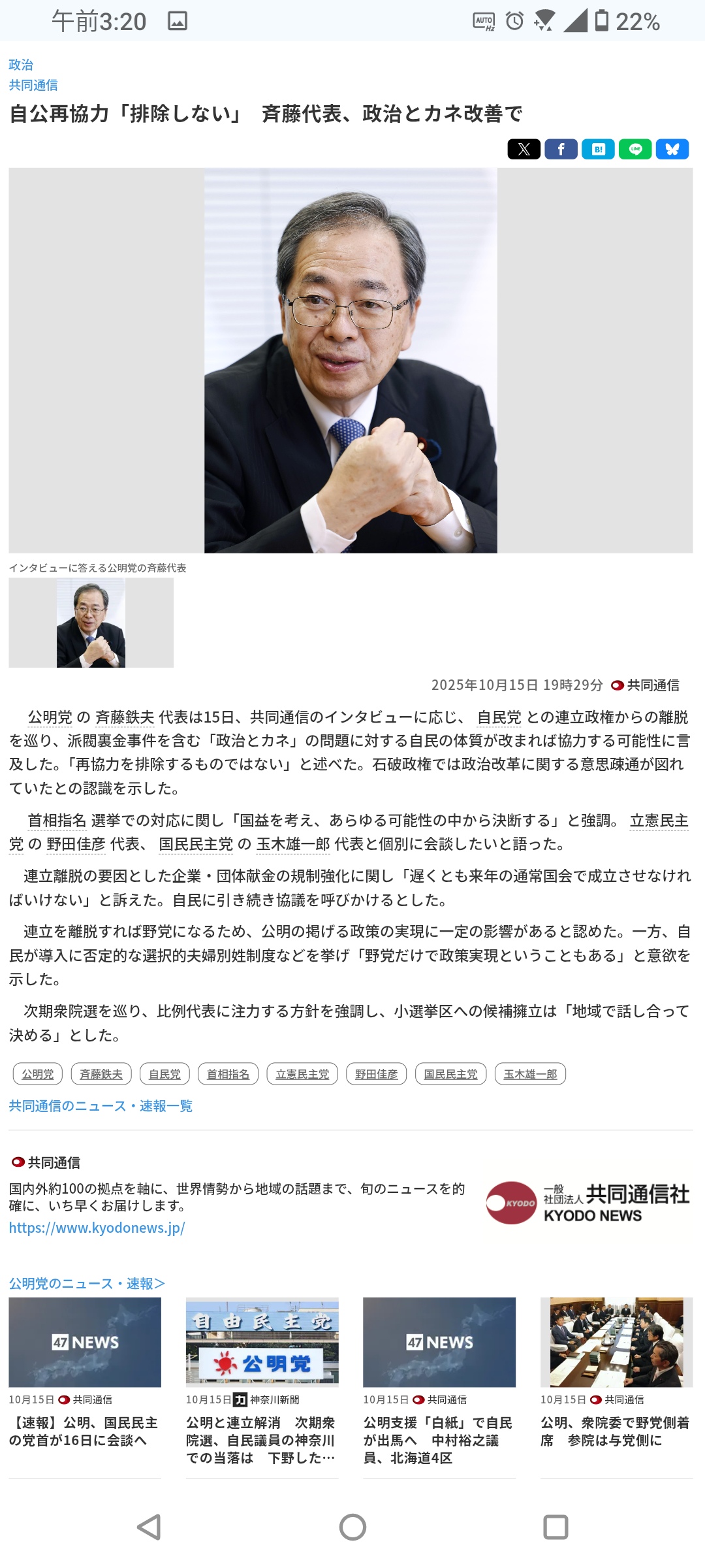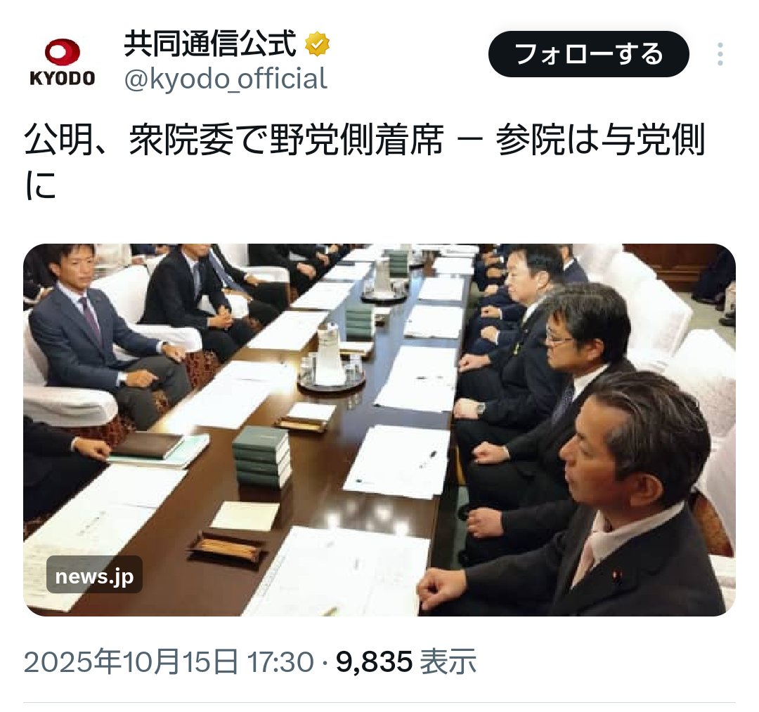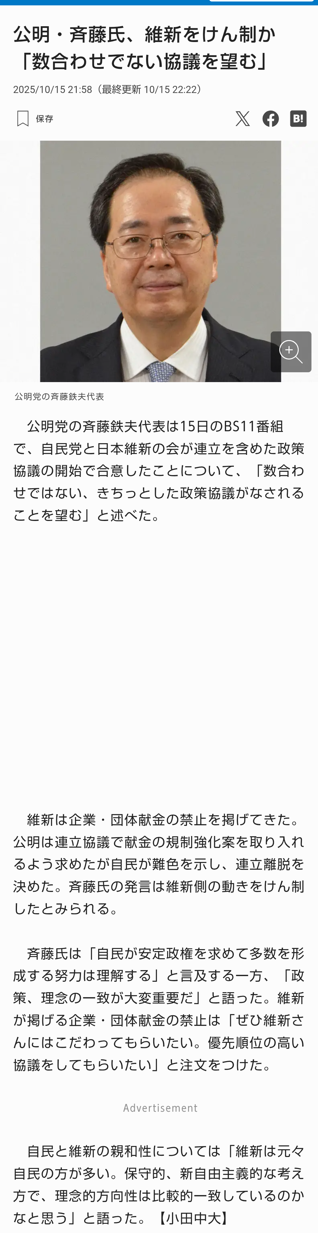 … | 11無題Name名無し 25/10/15(水)17:23:59No.753093+ 1760516639809.png-(1038776 B) ![]() >小沢一郎氏、公明離脱の本当の理由は「高市総裁の『考え方・発想・体質』そのものへの拒否感」 |