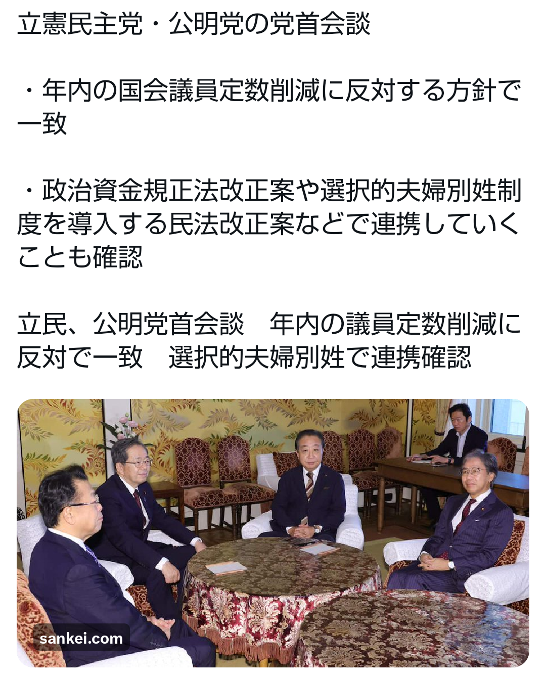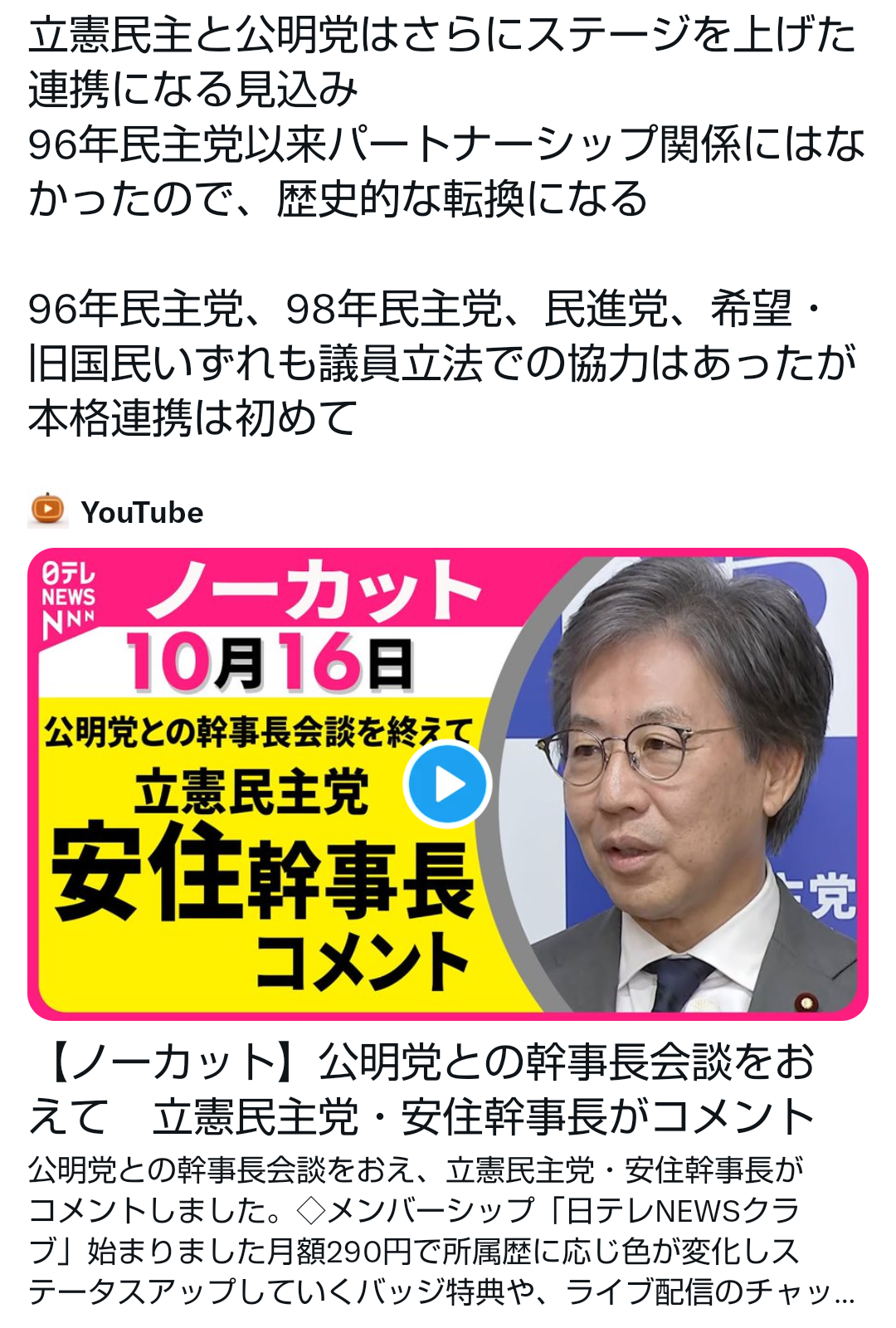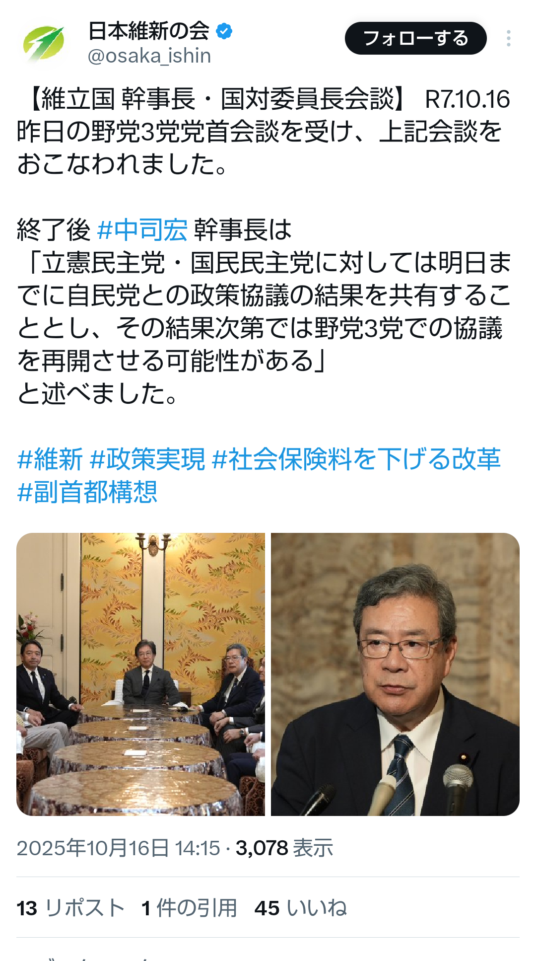 … | 5無題Name名無し 25/10/15(水)17:06:39No.753087+>午後4時から始まった立憲・維新・国民の党首会談が終わりました。 |