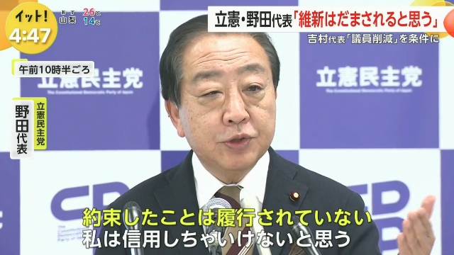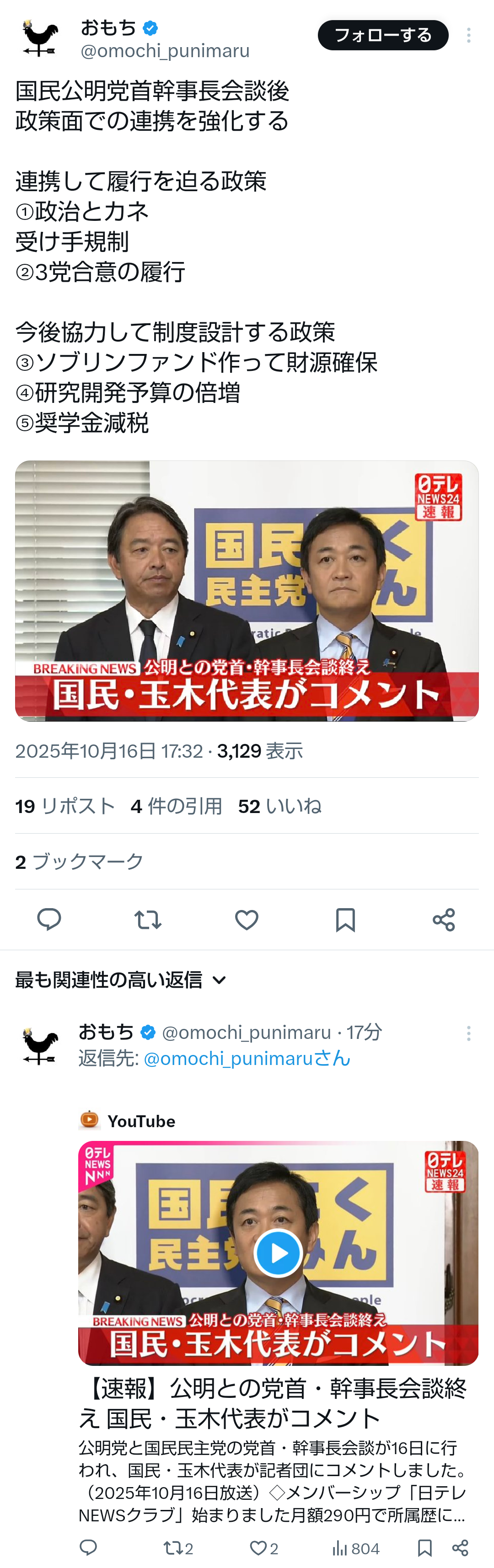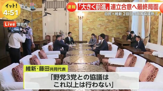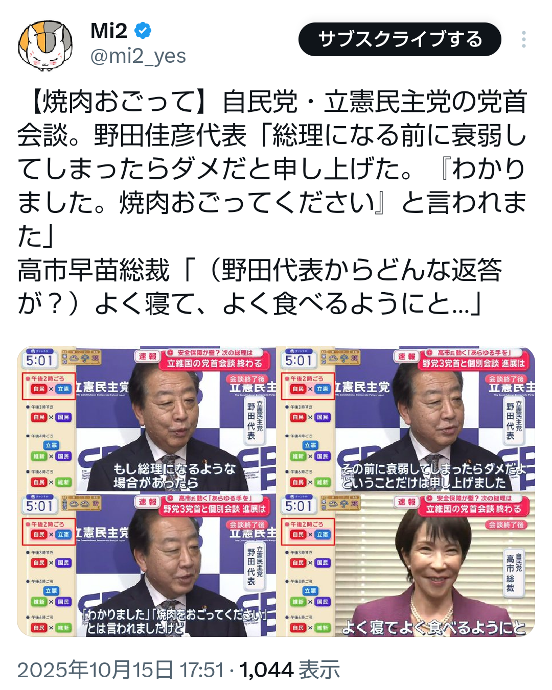 … | 5無題Name名無し 25/10/15(水)17:06:39No.753087+>午後4時から始まった立憲・維新・国民の党首会談が終わりました。 |