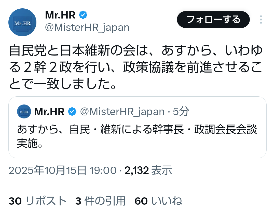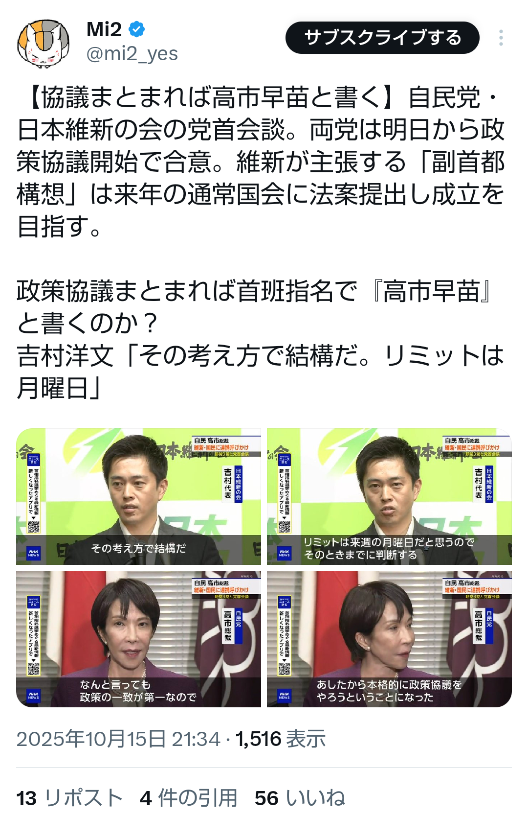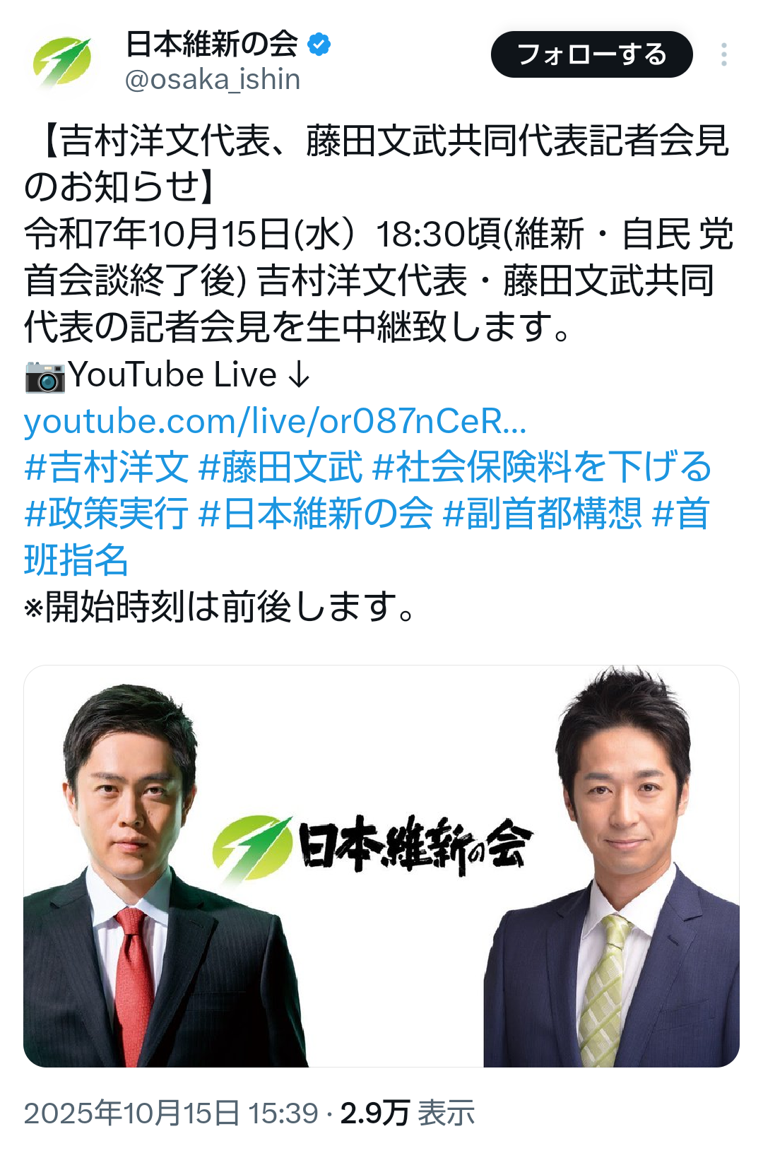 … | 59無題Name名無し 25/10/15(水)19:05:02No.753143+ 1760522702339.png-(164273 B) ![]() >自民党と日本維新の会は、あすから、いわゆる2幹2政を行い、政策協議を前進させることで一致しました。 |
