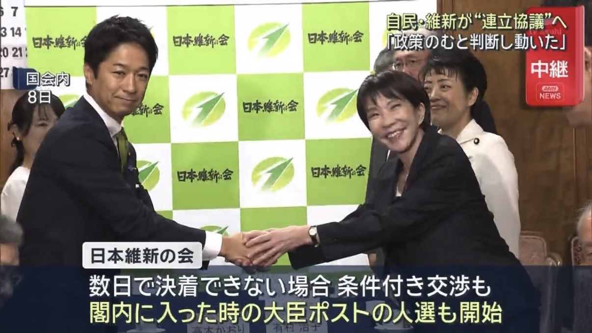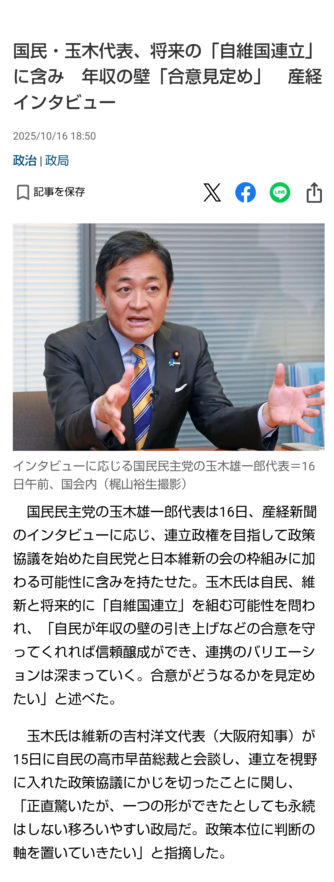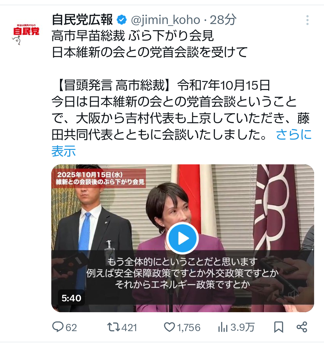… | 59無題Name名無し 25/10/15(水)19:05:02No.753143+ 1760522702339.png-(164273 B) ![]() >自民党と日本維新の会は、あすから、いわゆる2幹2政を行い、政策協議を前進させることで一致しました。 |