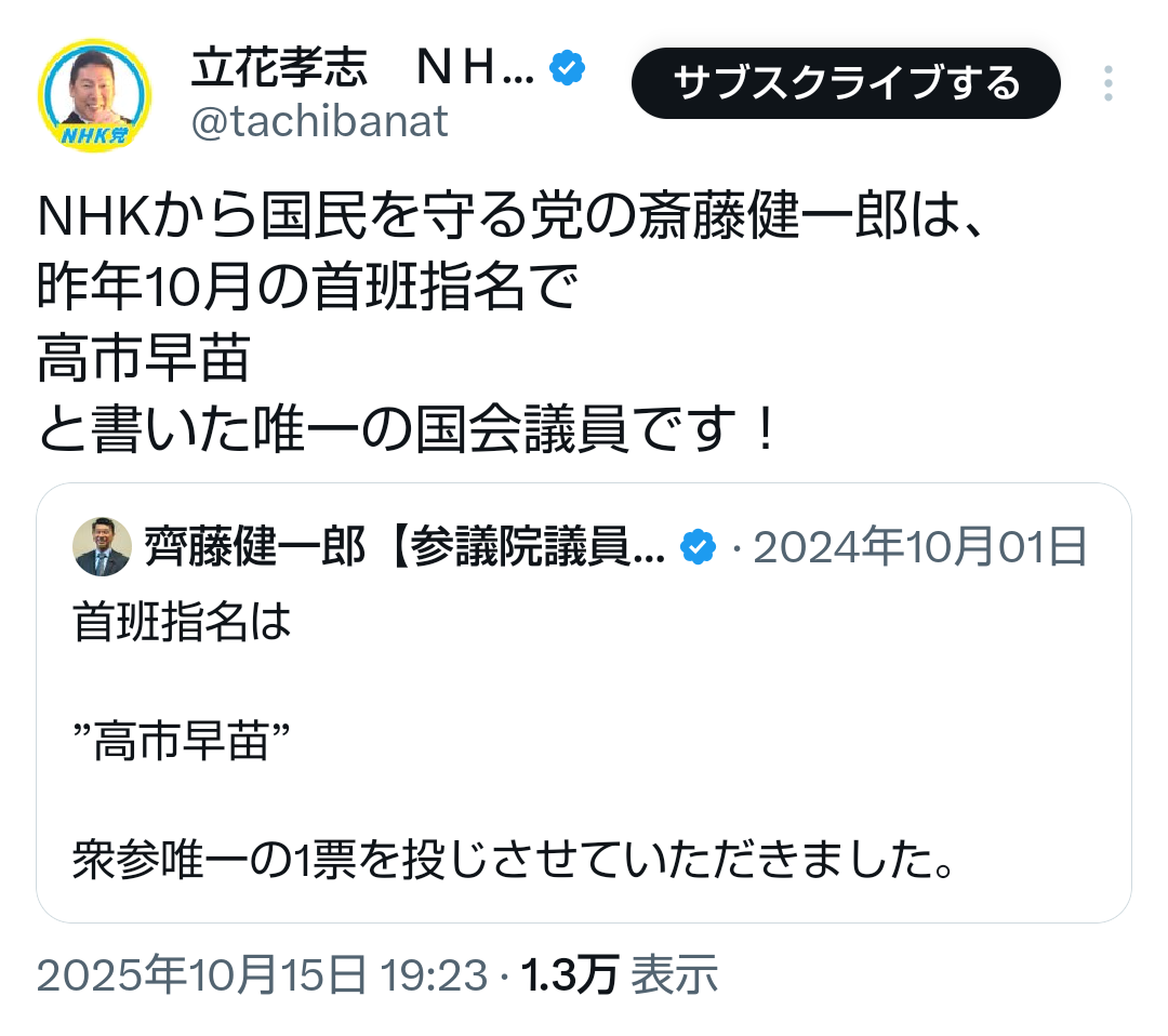 … | 36無題Name名無し 25/10/15(水)18:10:43No.753118そうだねx2元々N党の綱領はNHKのスクランブル化しかなくてその他は自由なんだよな…基本はそれ以外は自民党に賛成すると言ってたのもある |