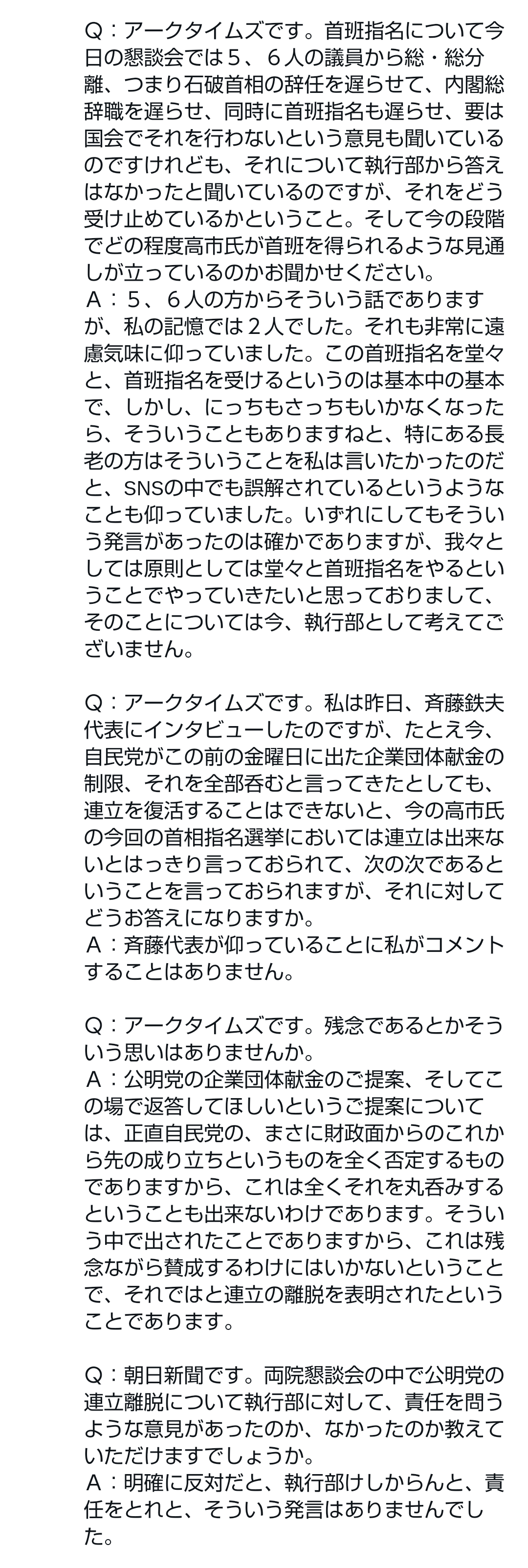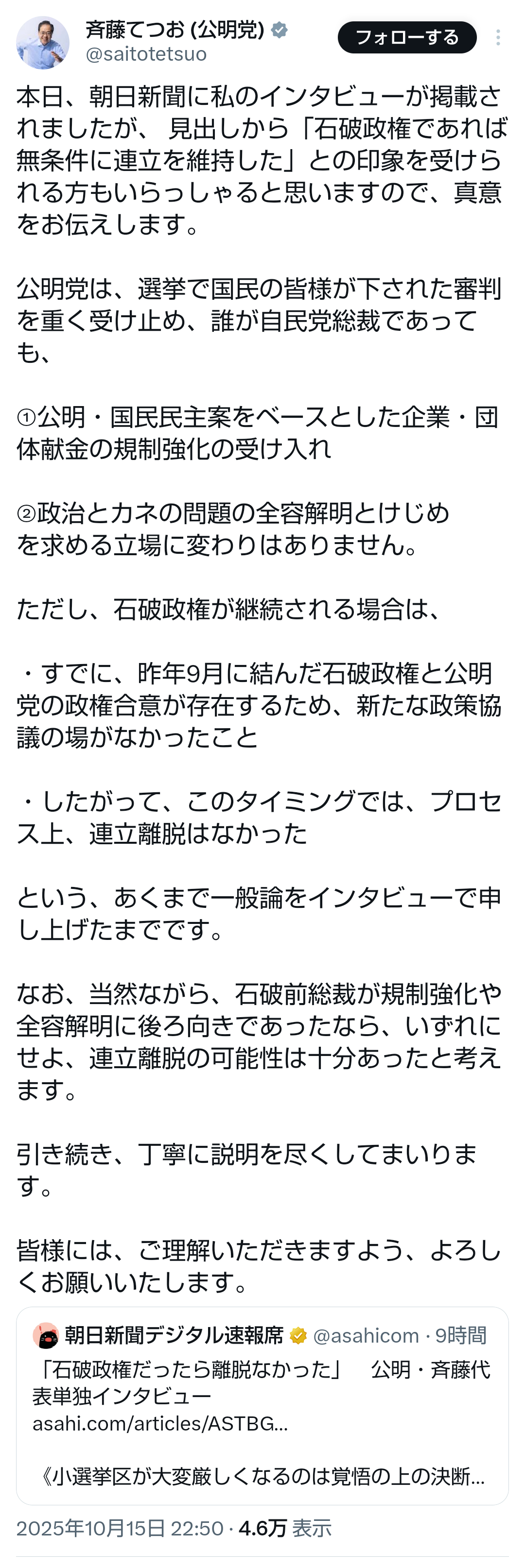 … | 74無題Name名無し 25/10/15(水)19:52:43No.753158+ 1760525563789.png-(1009482 B) ![]() >Q:アークタイムズです。私は昨日、斉藤鉄夫代表にインタビューしたのですが、たとえ今、自民党がこの前の金曜日に出た企業団体献金の制限、それを全部呑むと言ってきたとしても、連立を復活することはできないと、今の高市氏の今回の首相指名選挙においては連立は出来ないとはっきり言っておられて、次の次であるということを言っておられますが、それに対してどうお答えになりますか。 |