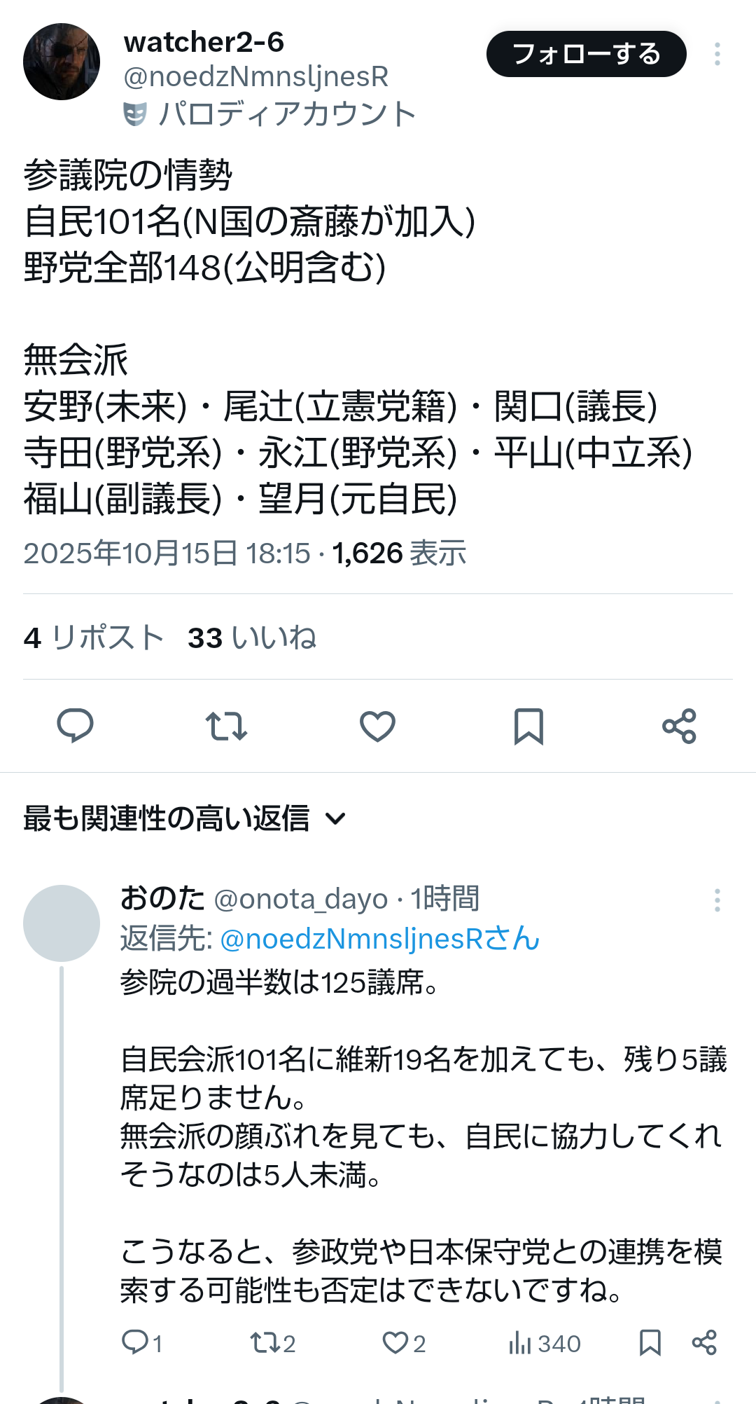 … | 77無題Name名無し 25/10/15(水)20:01:37No.753161+野党といえど政策協議ができてその政策は飲める余地があるなら共闘するにやぶさかではないしね |