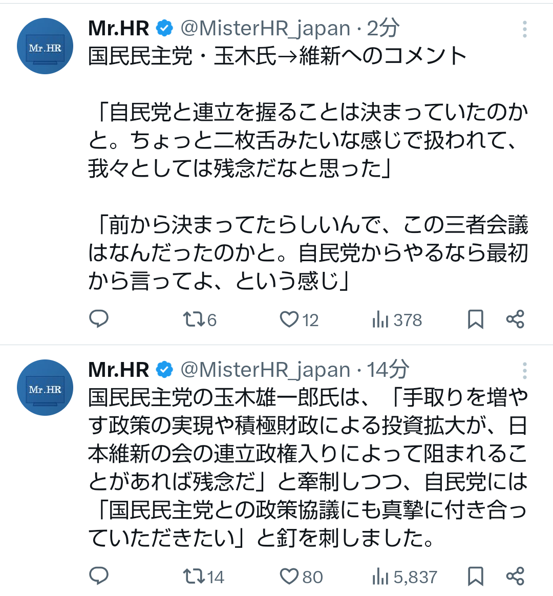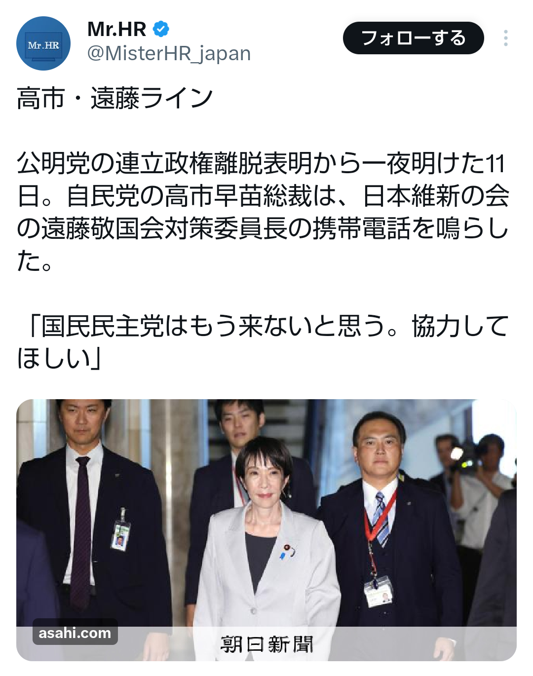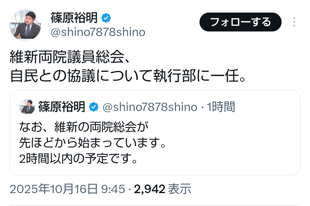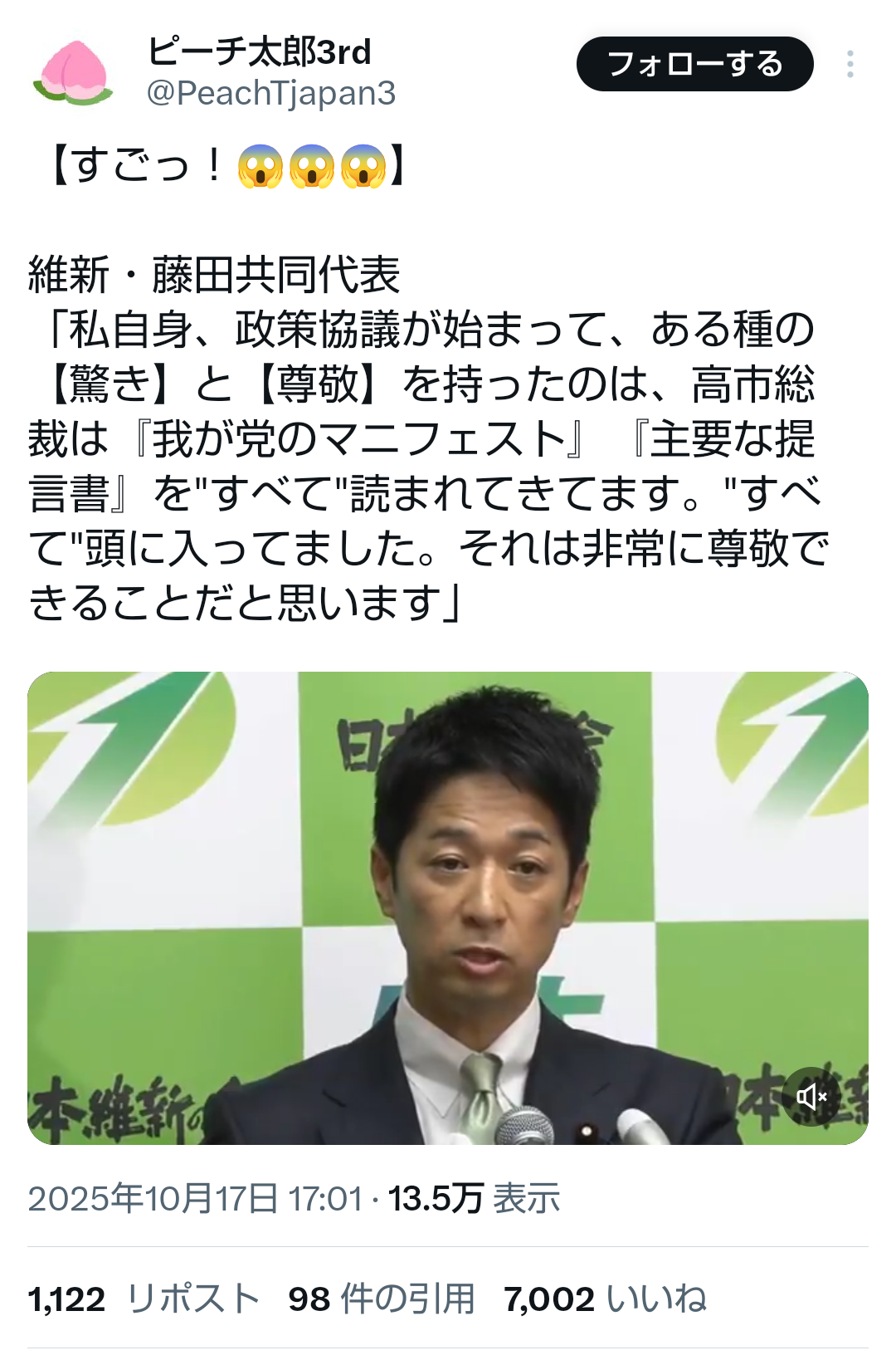 … | 68無題Name名無し 25/10/15(水)19:35:28No.753152そうだねx2>【速報】維新代表、政策協議まとまれば高市氏に投票 |