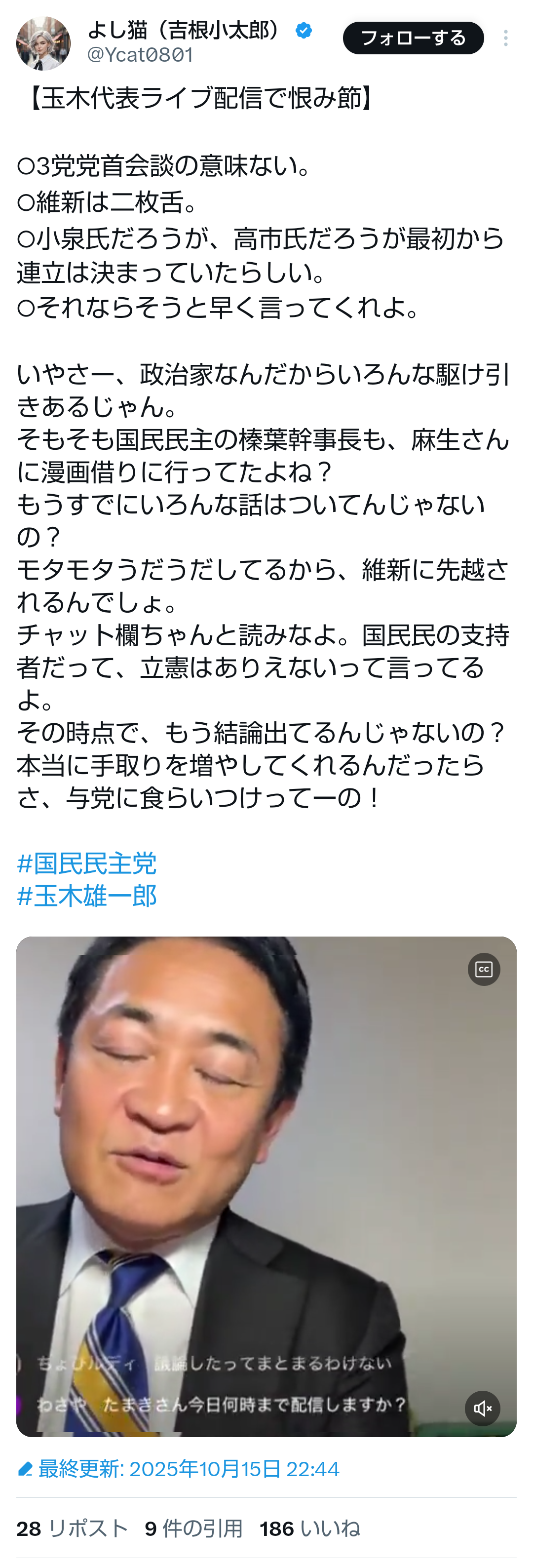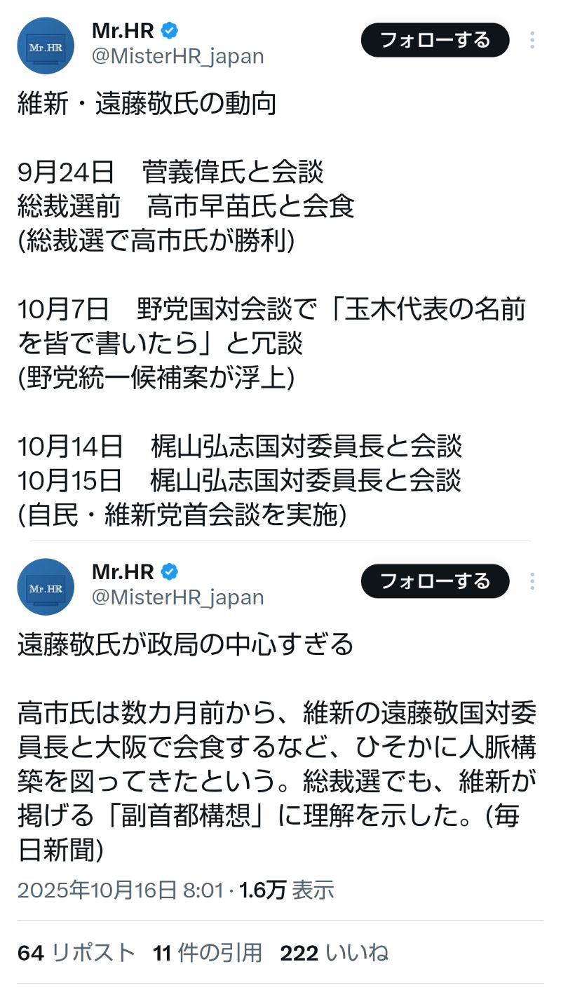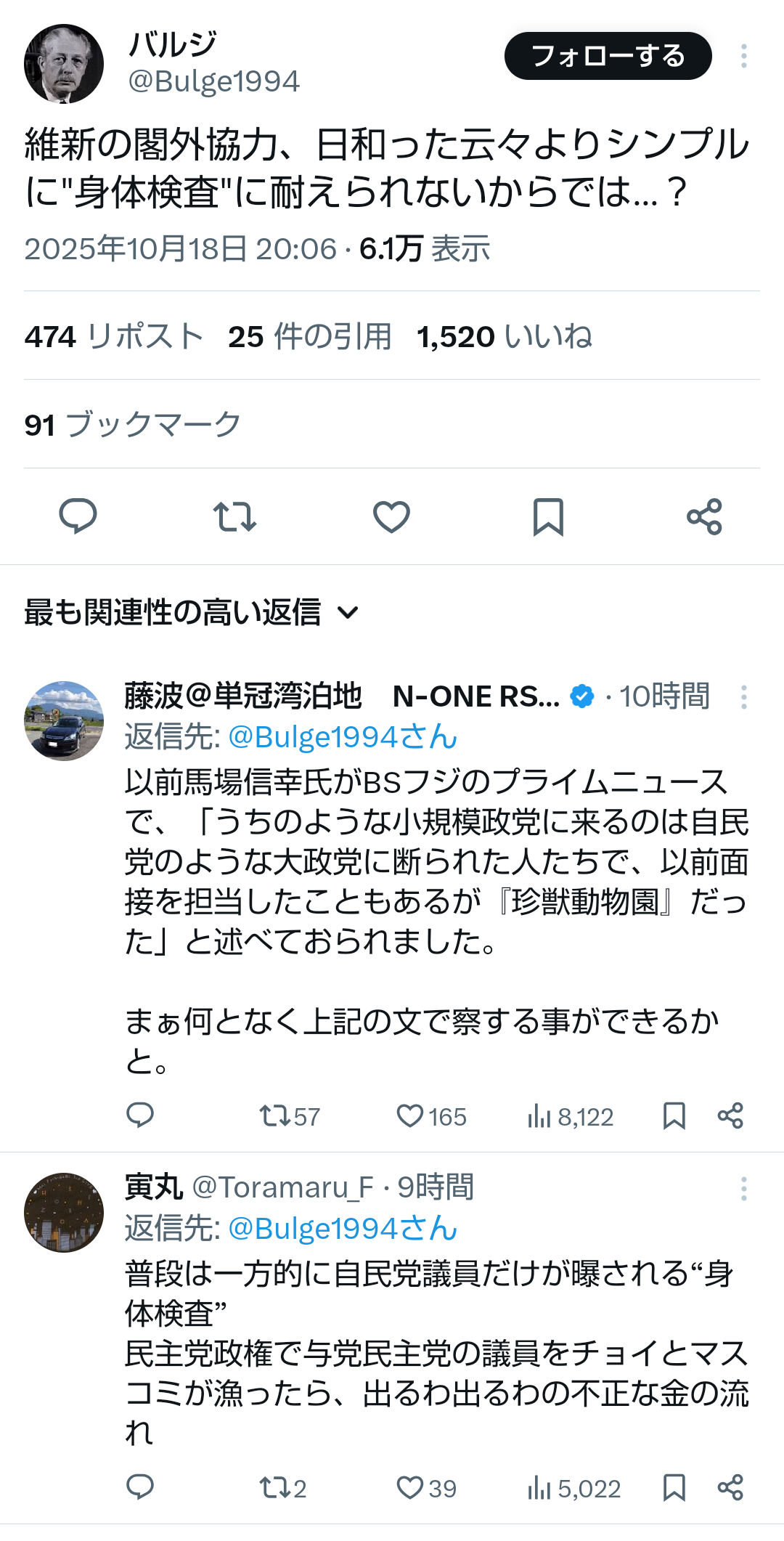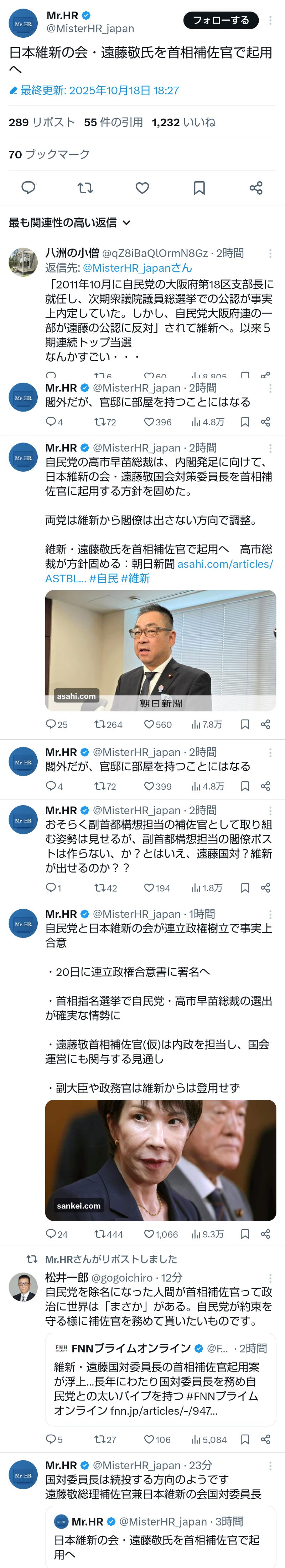 … | 766無題Name名無し 25/10/18(土)23:47:08No.753896+>維新内で連立反対の声出てたみたいなんだよね… |