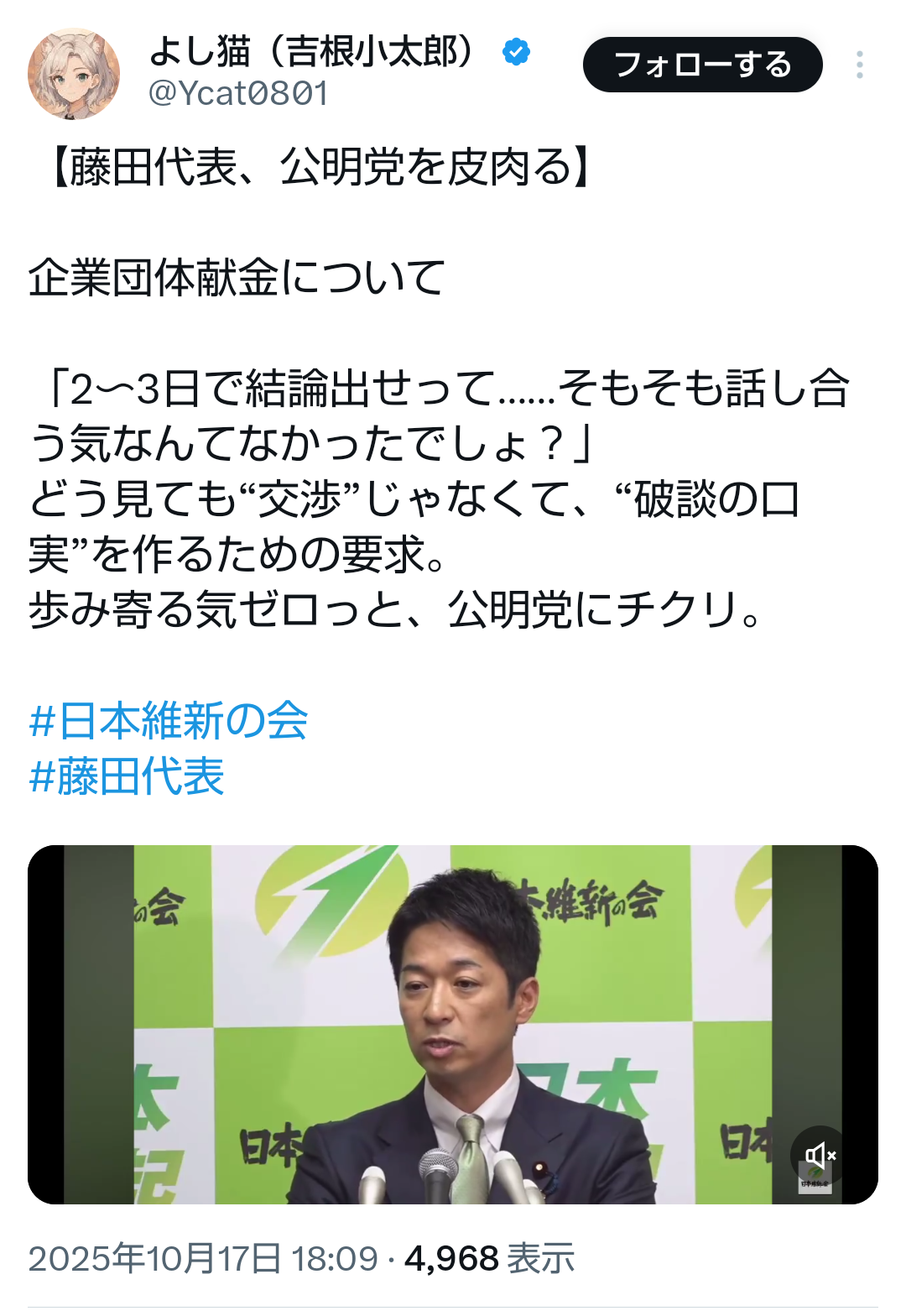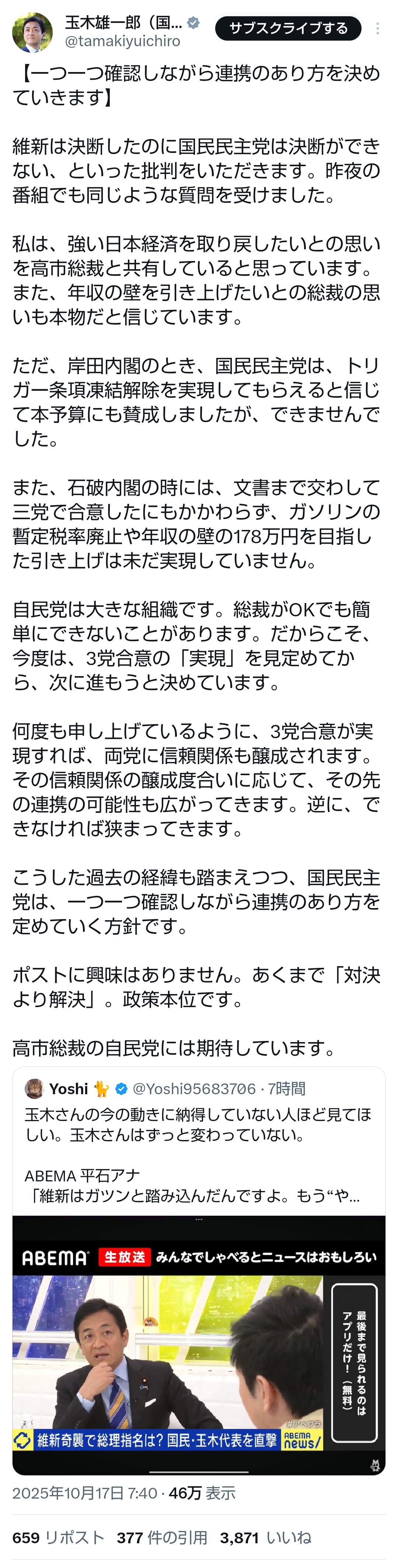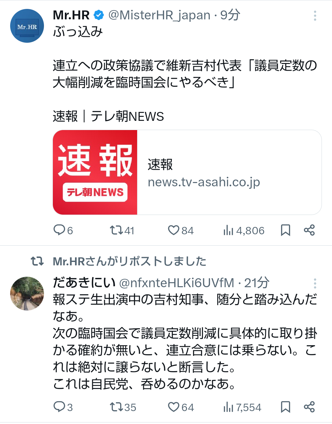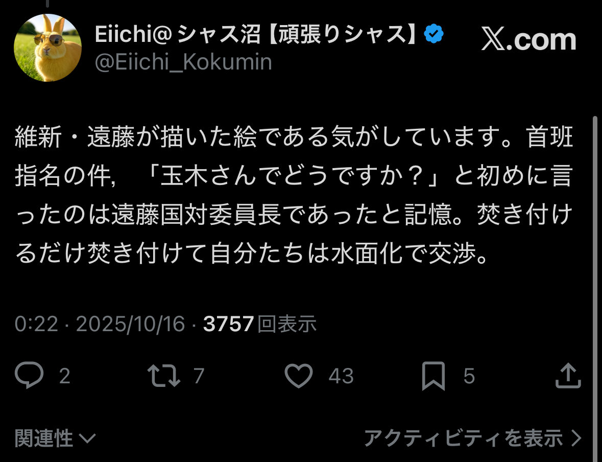 … | 766無題Name名無し 25/10/18(土)23:47:08No.753896+>維新内で連立反対の声出てたみたいなんだよね… |