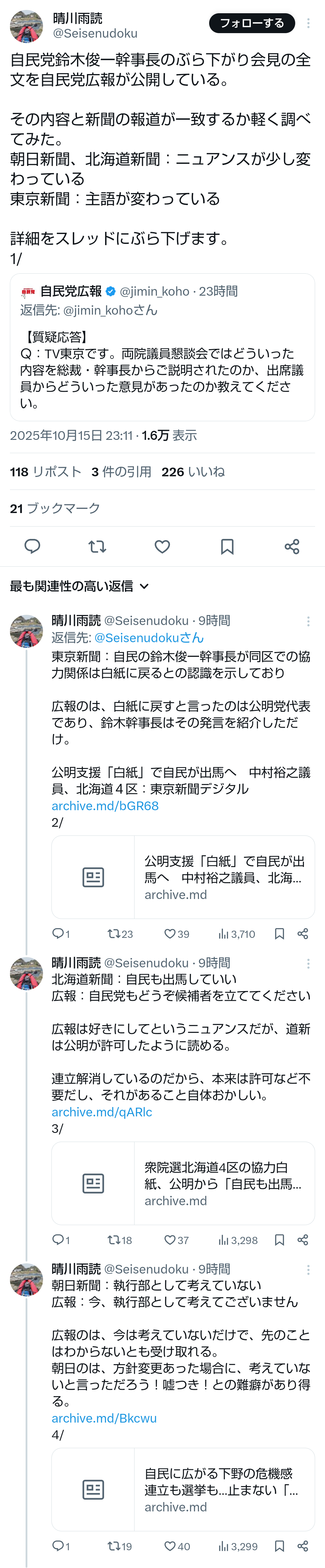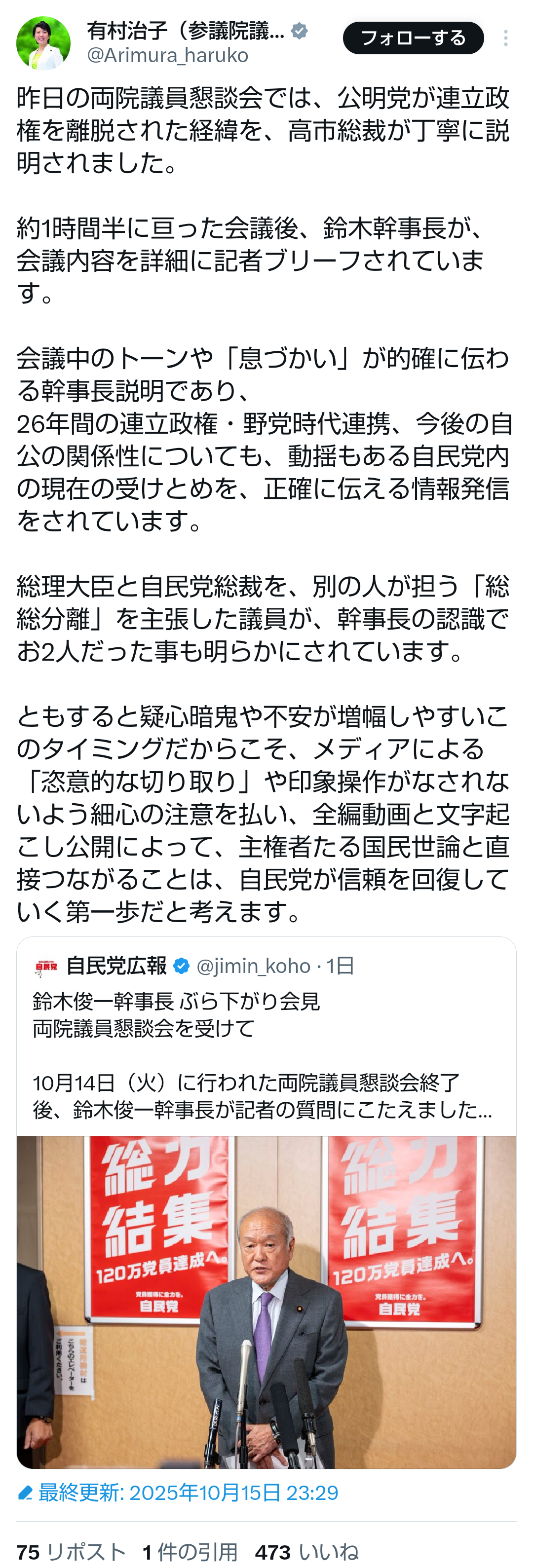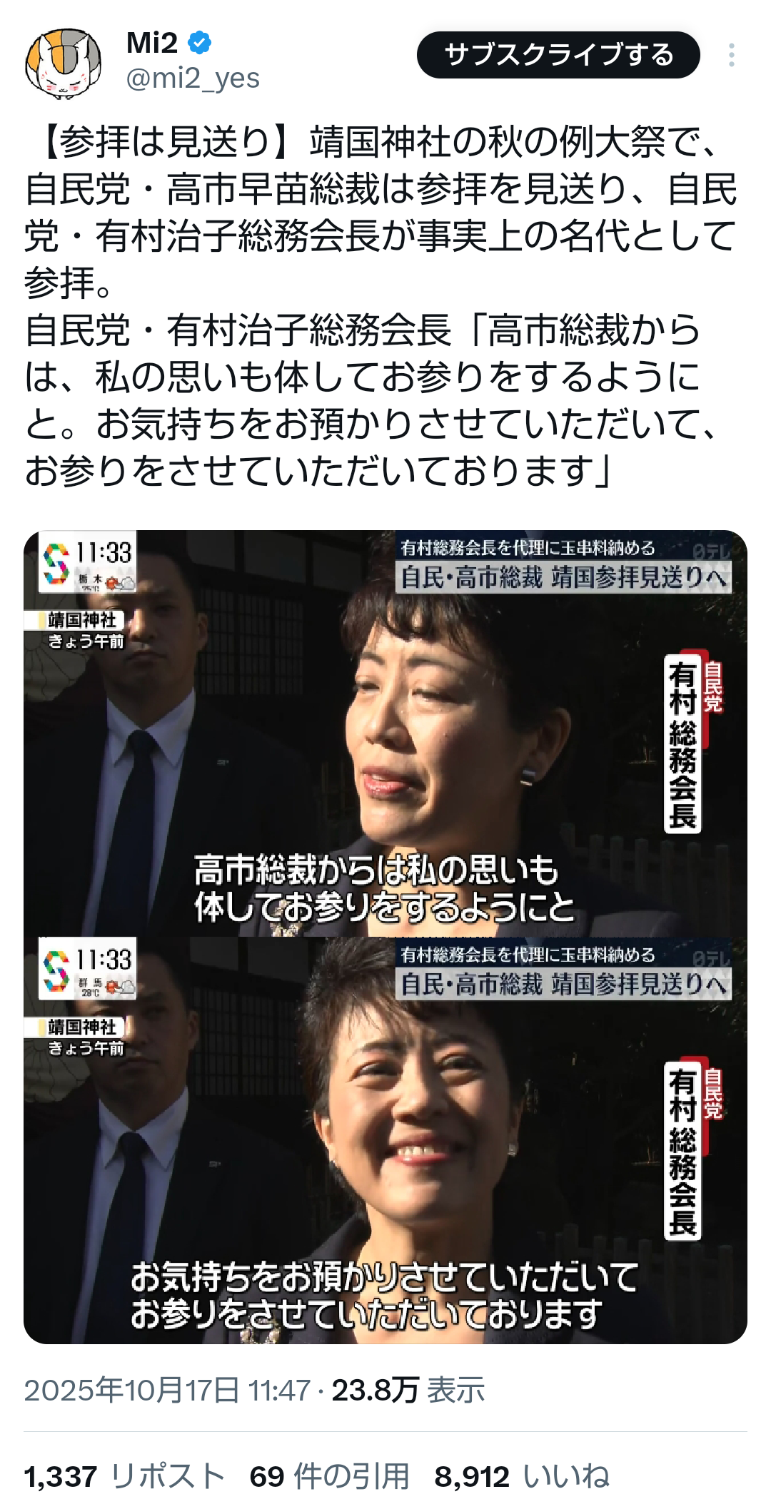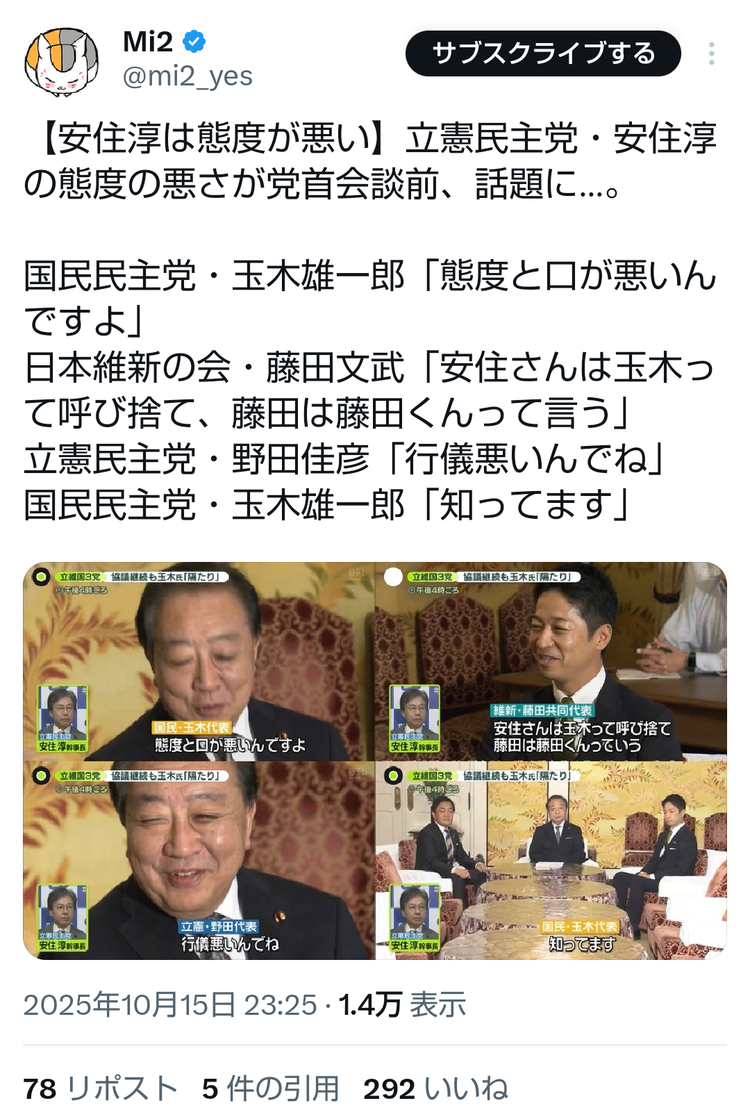 … | 10無題Name名無し 25/10/15(水)17:22:15No.753092+この件であんま反高市に持ってくんじゃねえぞって指示受けたのかしら? |