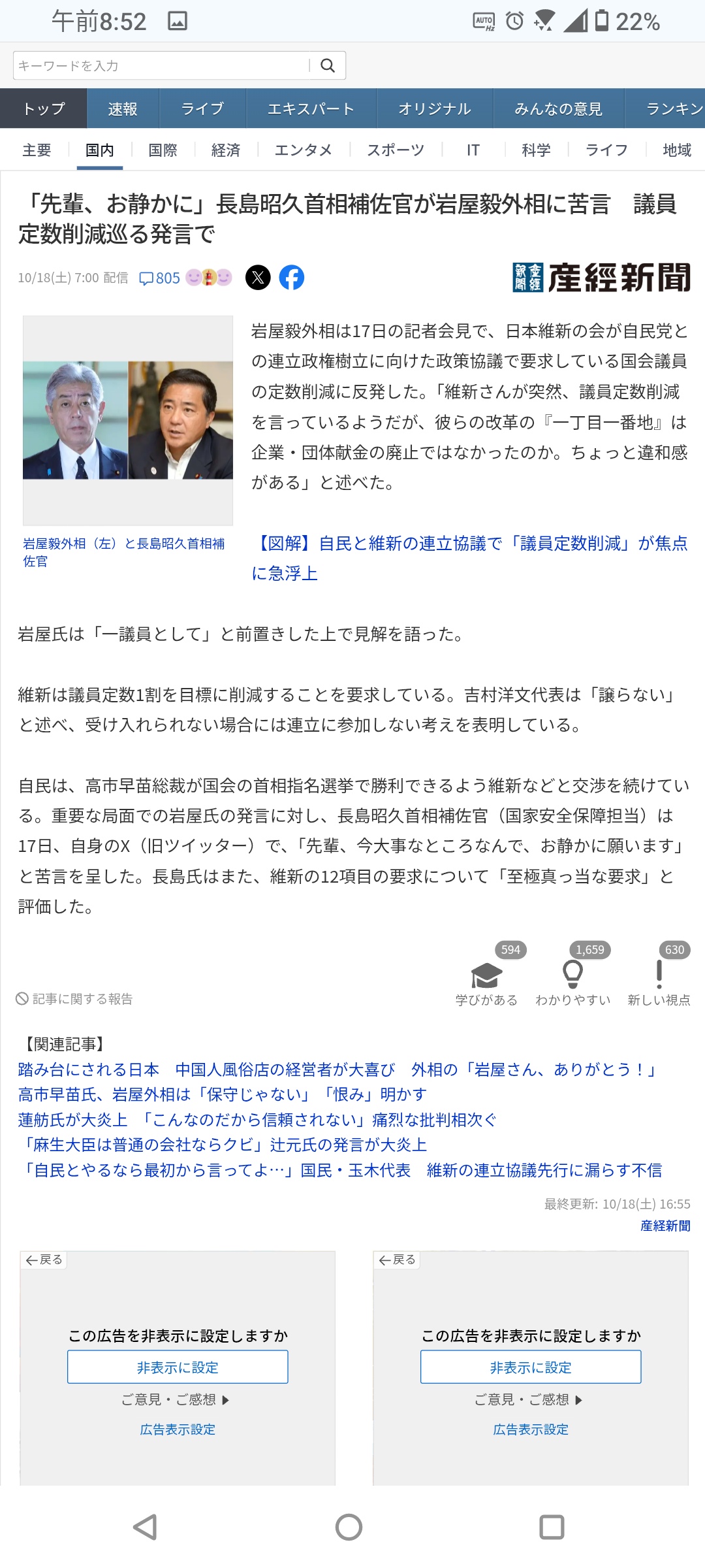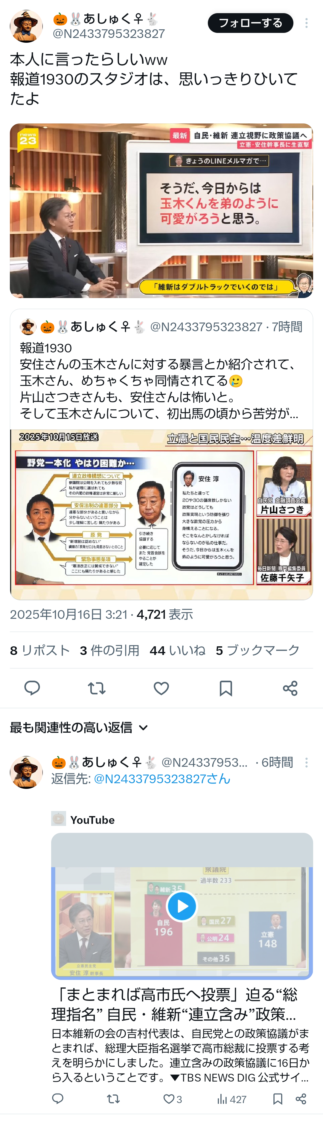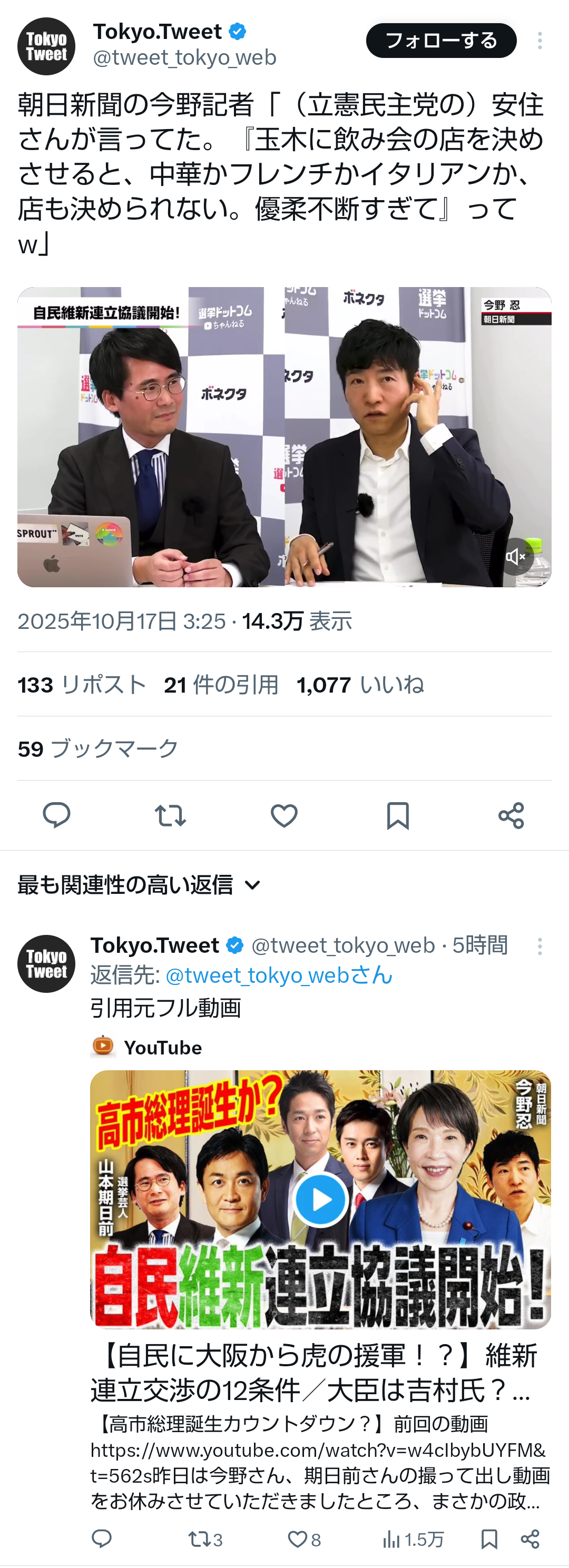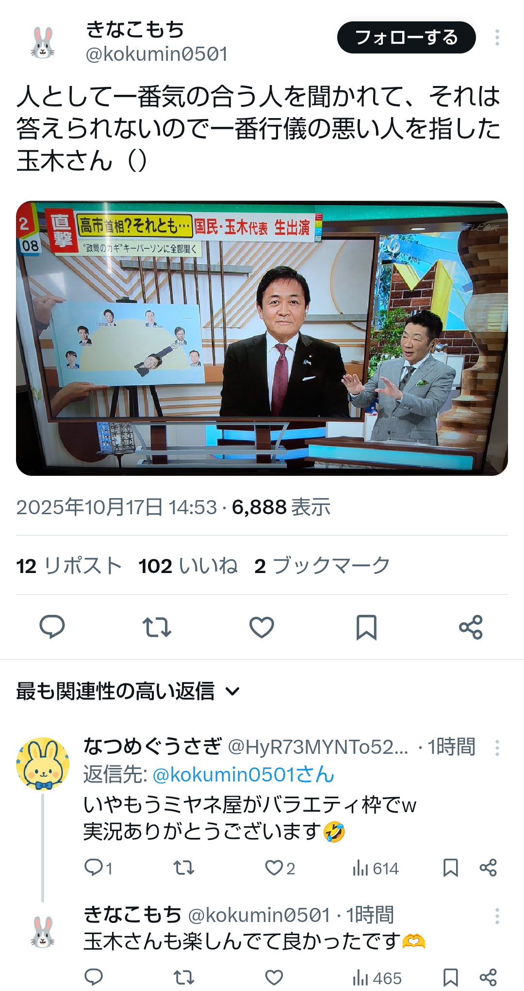 … | 10無題Name名無し 25/10/15(水)17:22:15No.753092+この件であんま反高市に持ってくんじゃねえぞって指示受けたのかしら? |