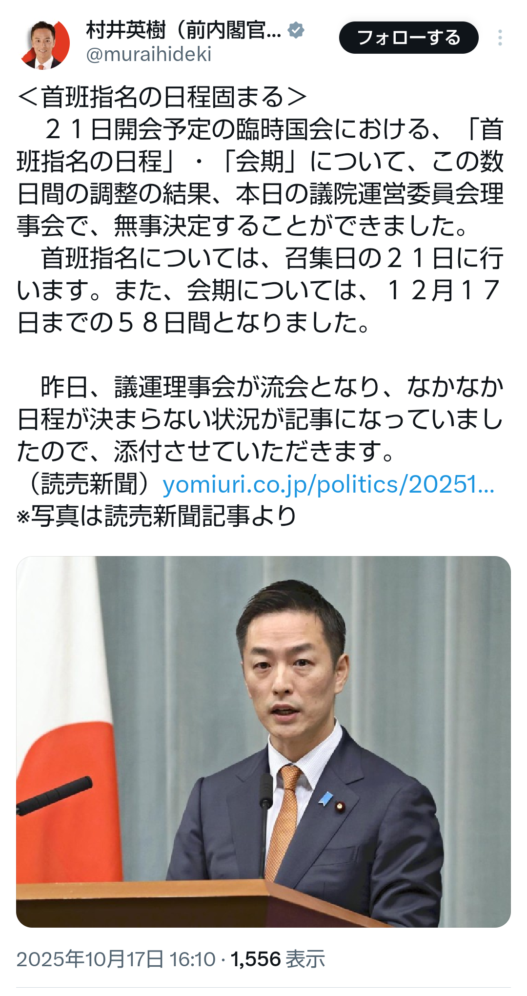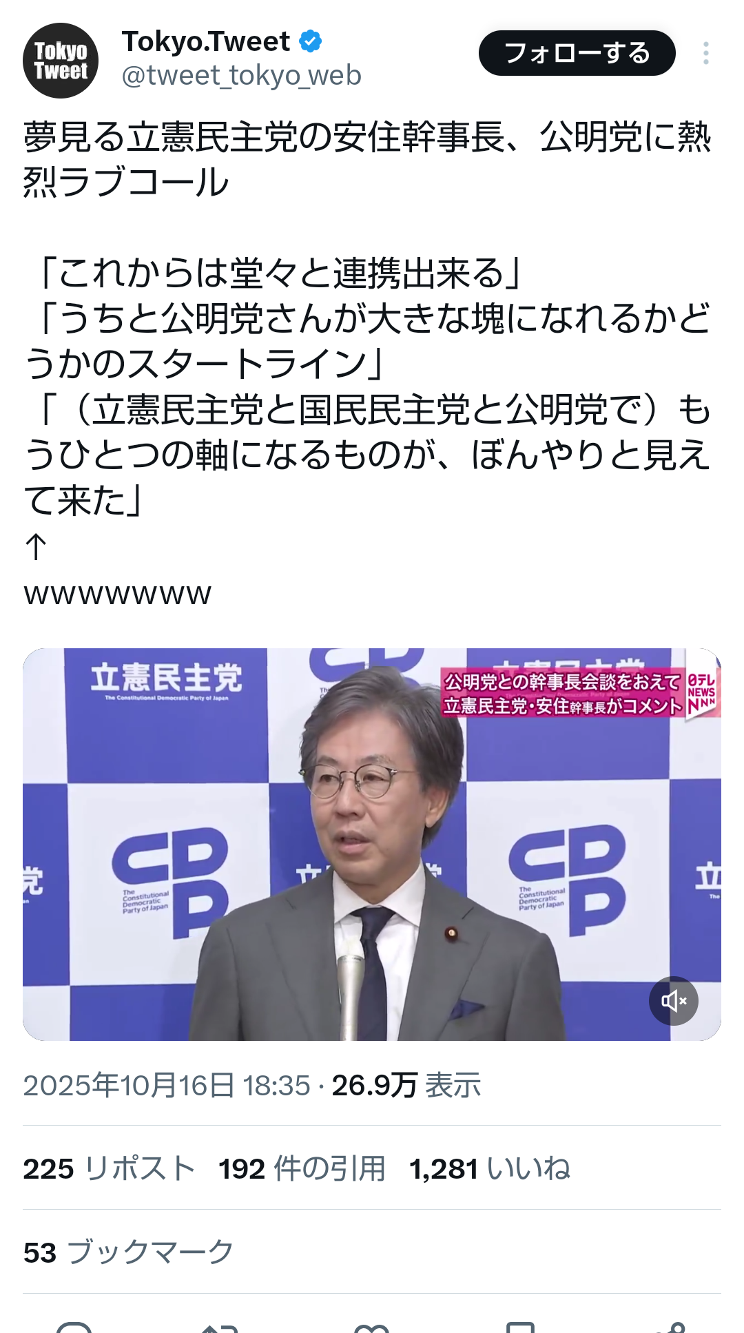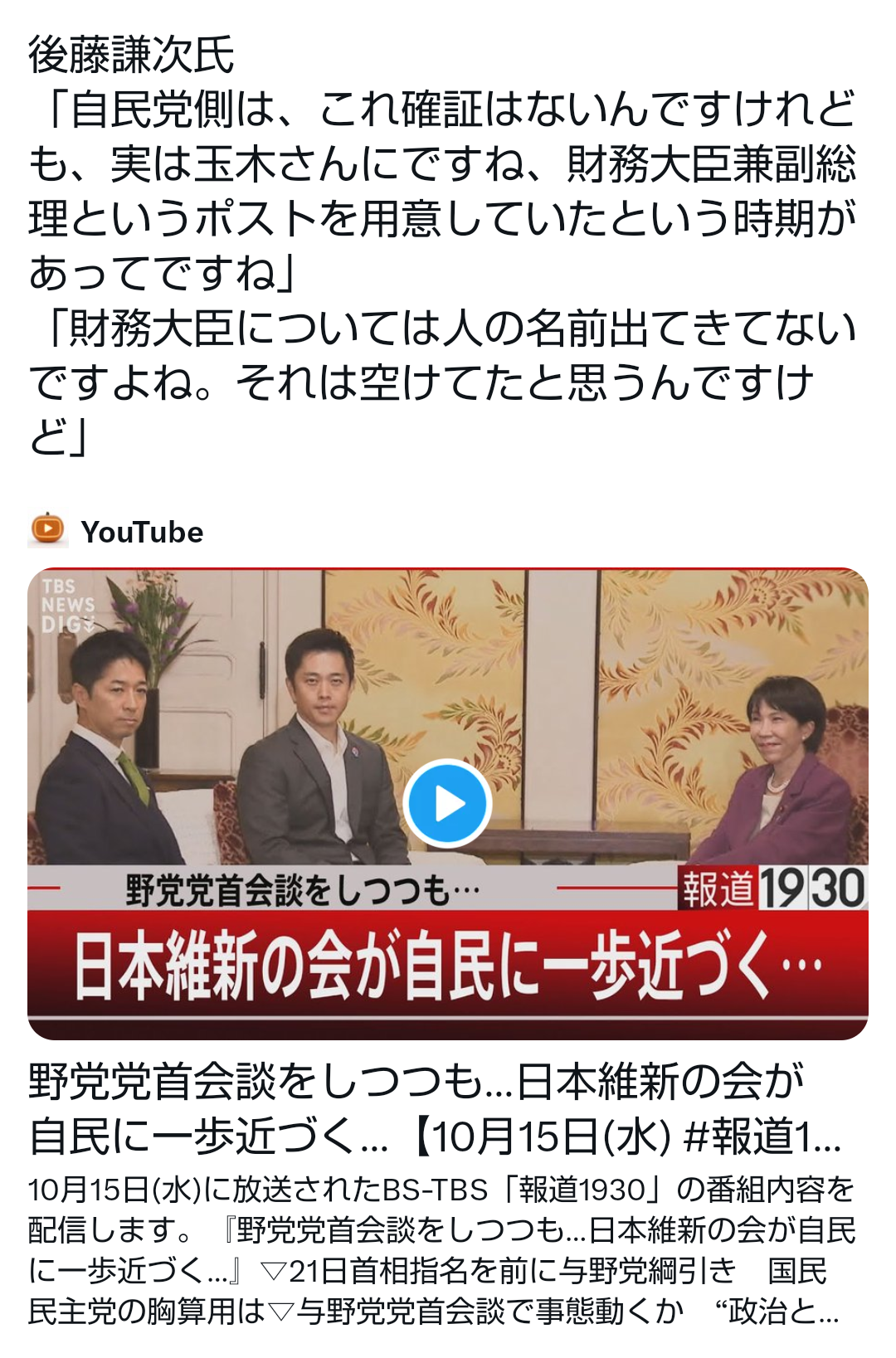 … | 789無題Name名無し 25/10/19(日)10:53:47No.753936+どう転ぶかは分からんけど公明党が連立解消して首班指名すらまだなのに |