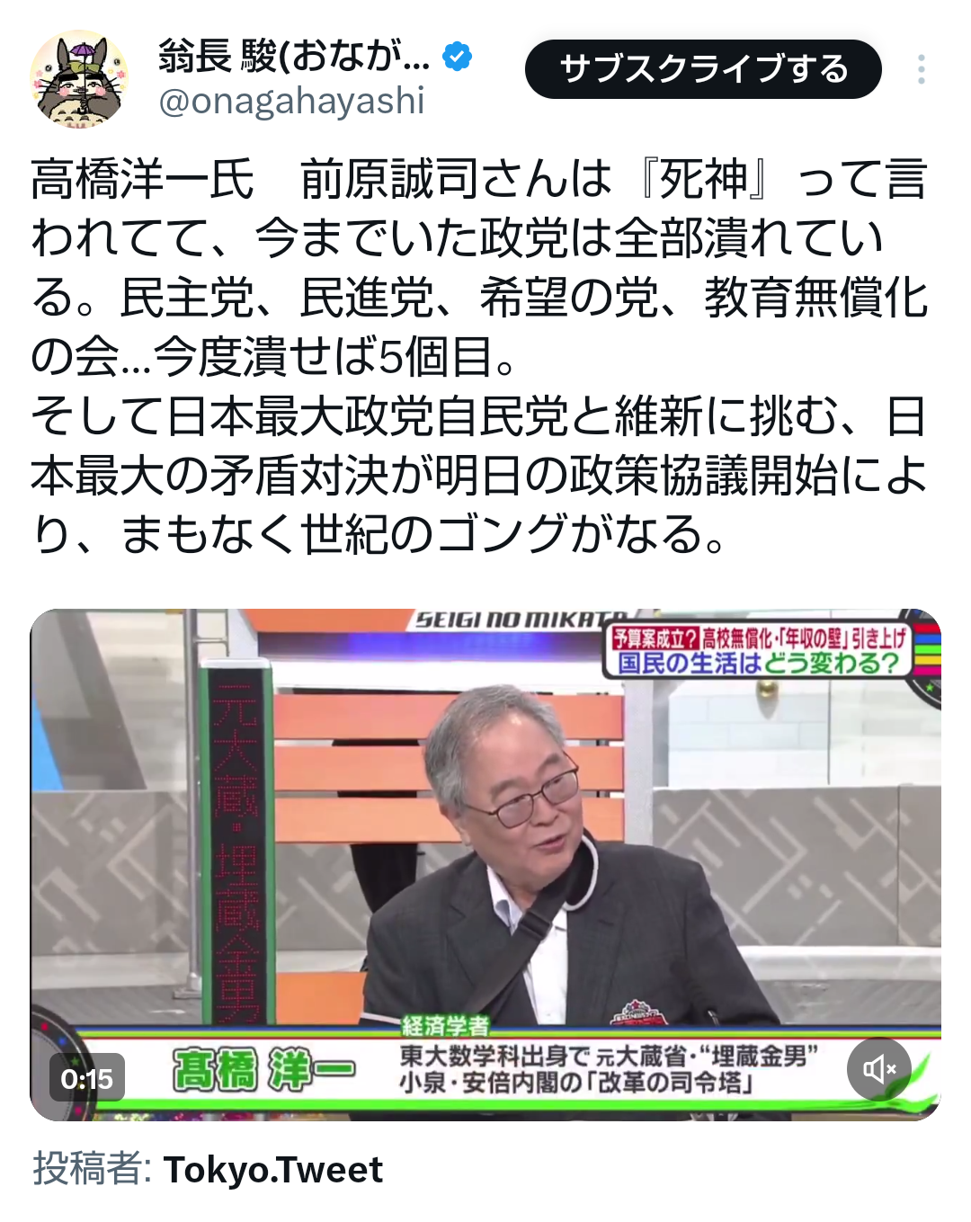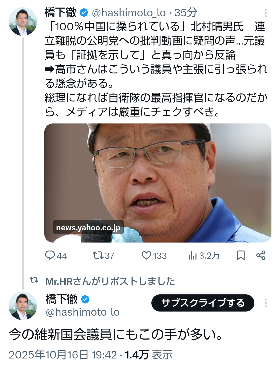 … | 90無題Name名無し 25/10/15(水)21:05:16No.753174そうだねx3橋下徹氏 高市氏の姿勢に危機感「事態予測力が低い人が自衛隊の最高指揮官になるのは、ほんまヤバい」 |