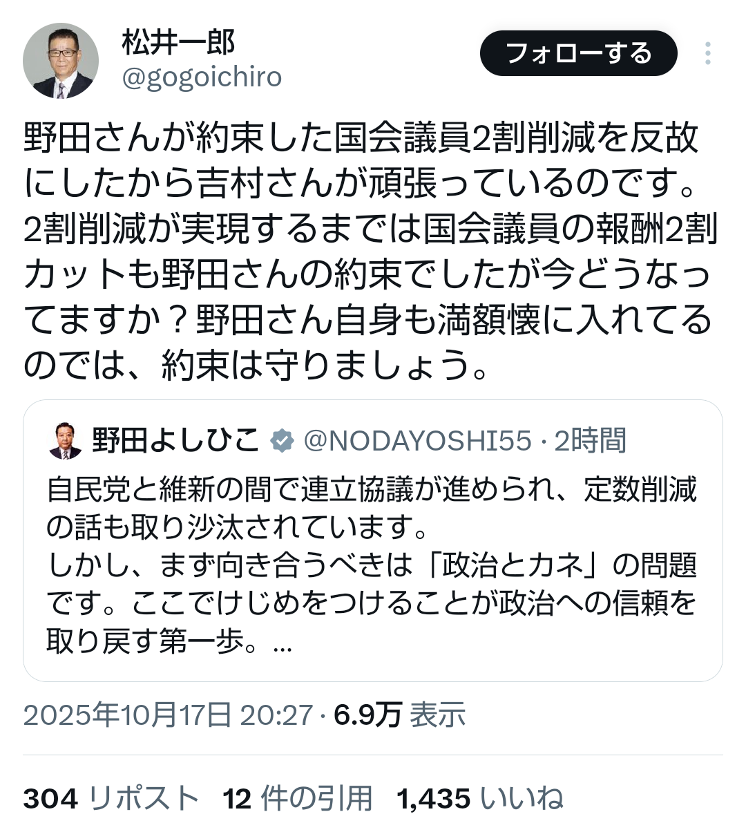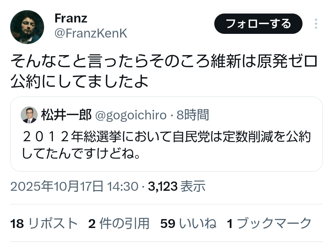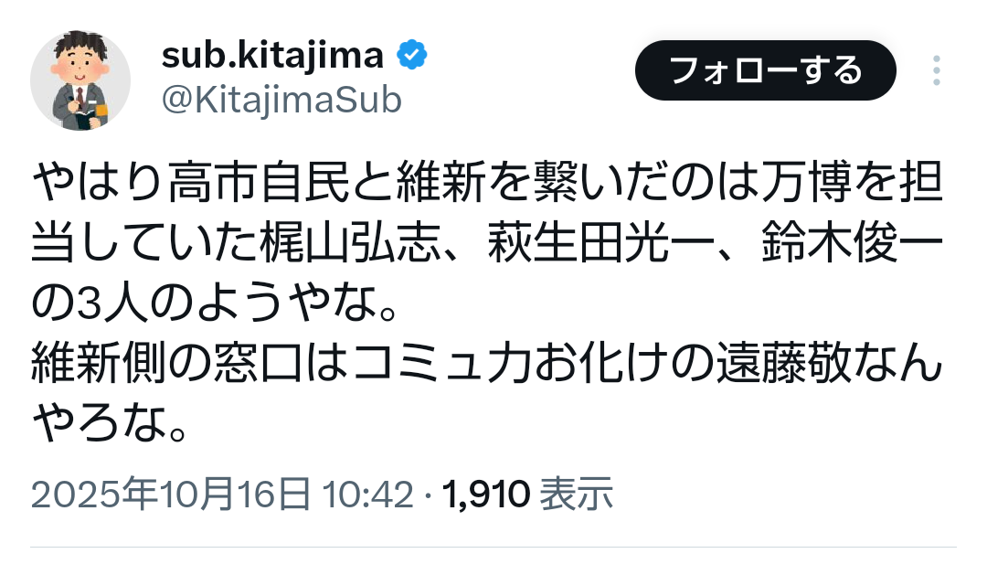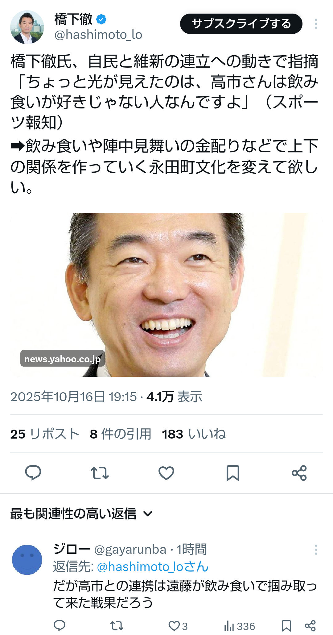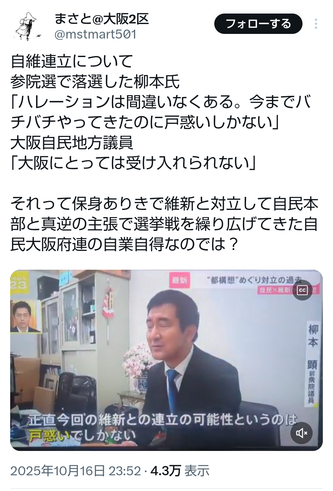 … | 767無題Name名無し 25/10/18(土)23:55:08No.753897+国政自民と大阪府連と維新の関係って複雑だからね |