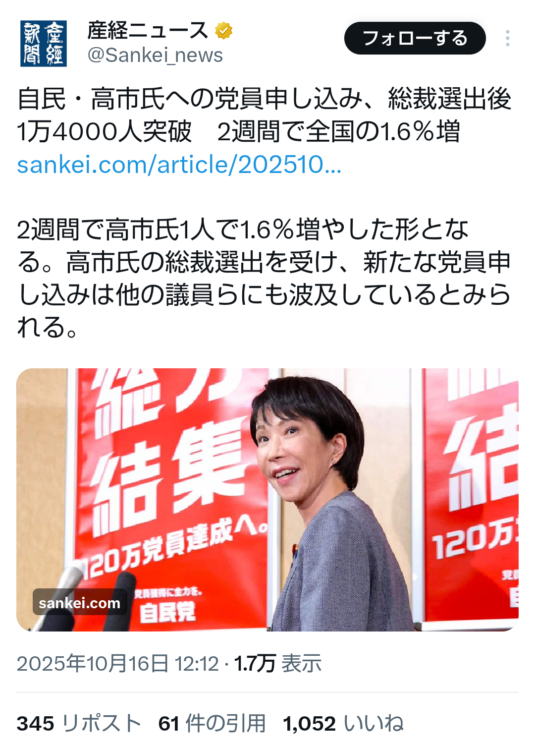 … | 60無題Name名無し 25/10/15(水)19:07:11No.753144そうだねx5とっとと高市内閣発足してくれほんと |