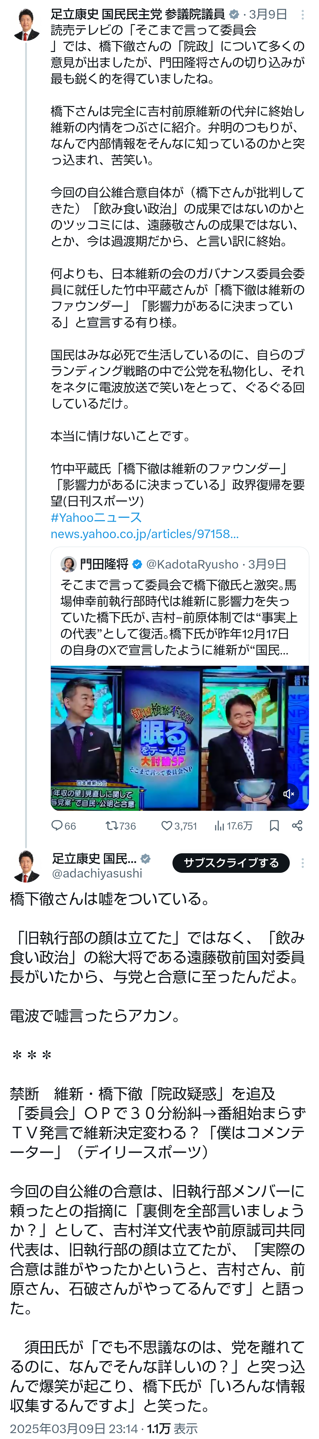 … | 13無題Name名無し 25/10/15(水)17:26:19No.753095そうだねx1共産党応援団のTBS的には田崎史郎氏はいい玩具なんだろうな |