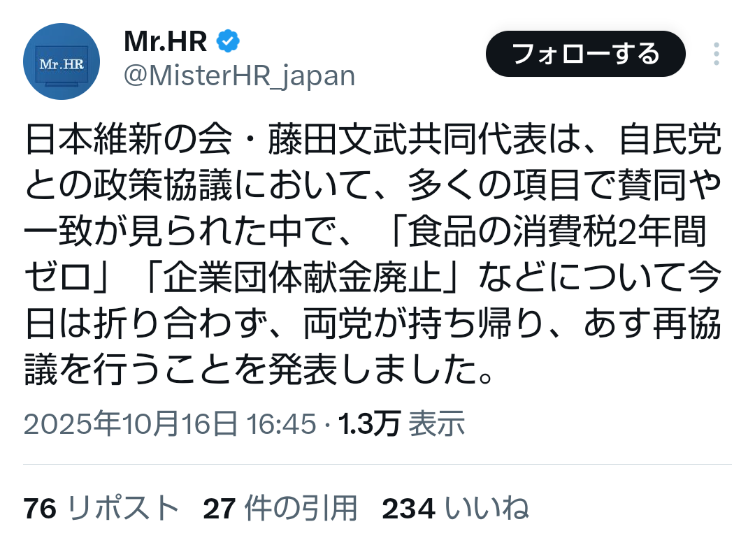… | 761無題Name名無し 25/10/18(土)22:29:26No.753890+結局自分で責任もって政策推進する気は無いのか野党 |
