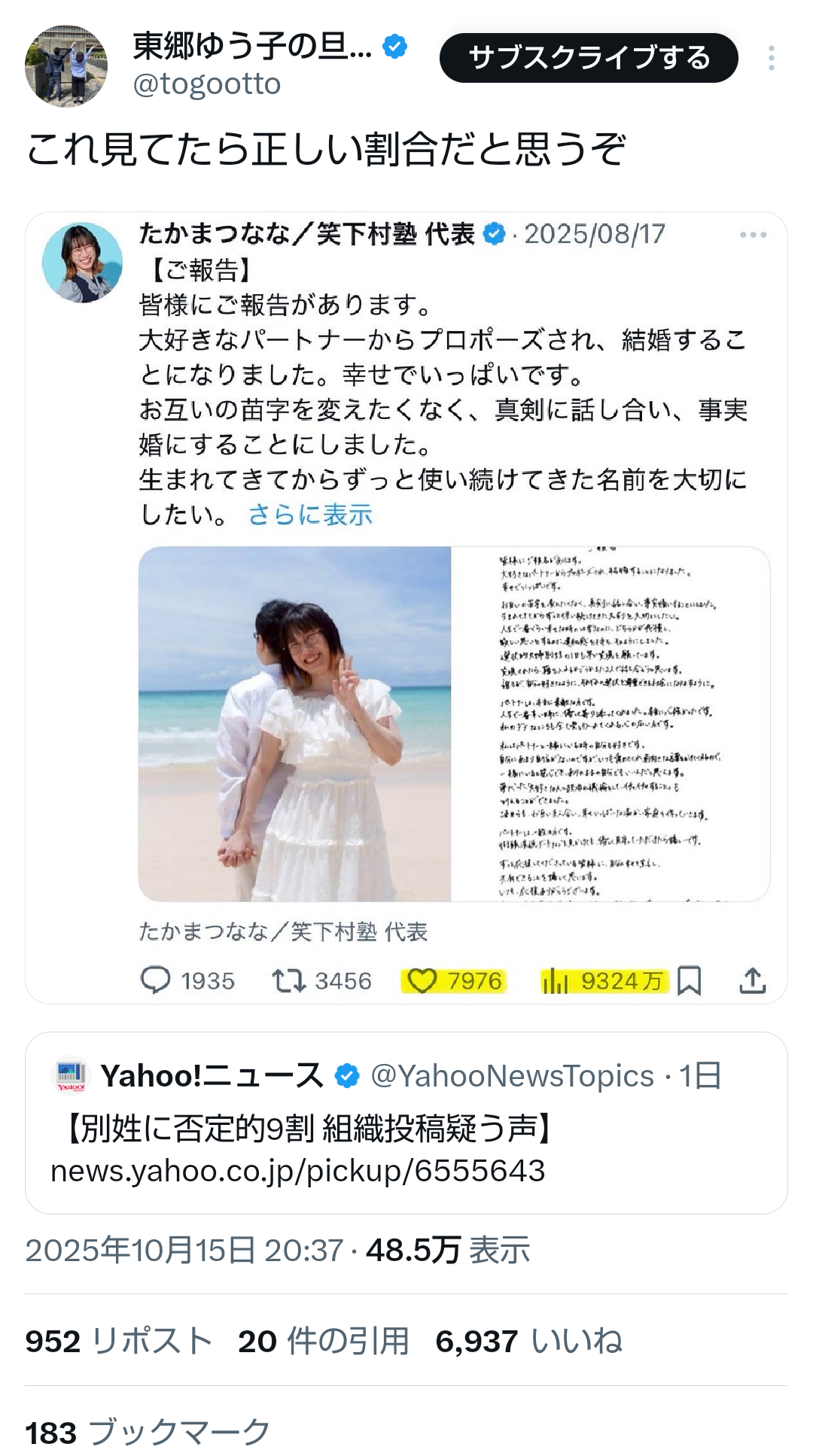 … | 50無題Name名無し 25/10/15(水)18:38:08No.753133そうだねx6>夫婦別姓に否定的「9割超」 政府パブコメ、組織投稿疑う声 |
