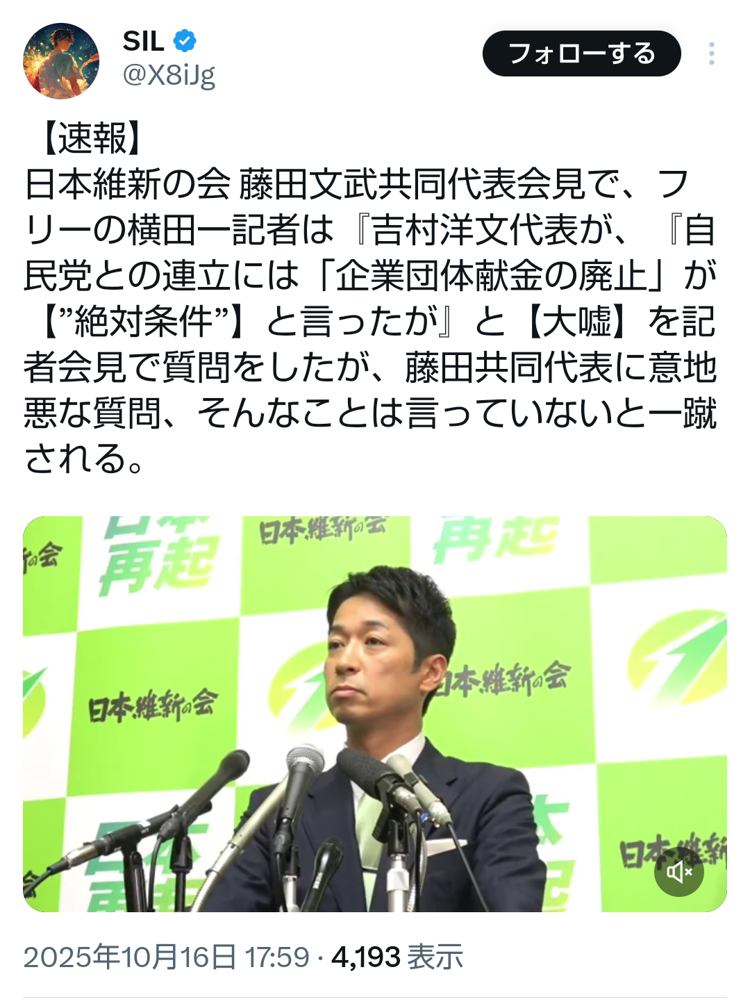 … | 762無題Name名無し 25/10/18(土)22:34:13No.753891+維新内で連立反対の声出てたみたいなんだよね…最近離党も多いし内部はグラグラしてるのかもしれない |