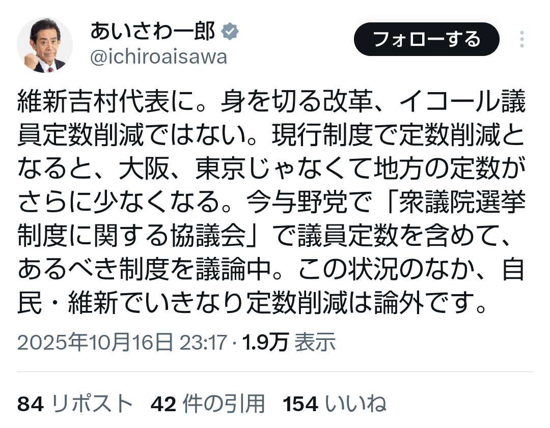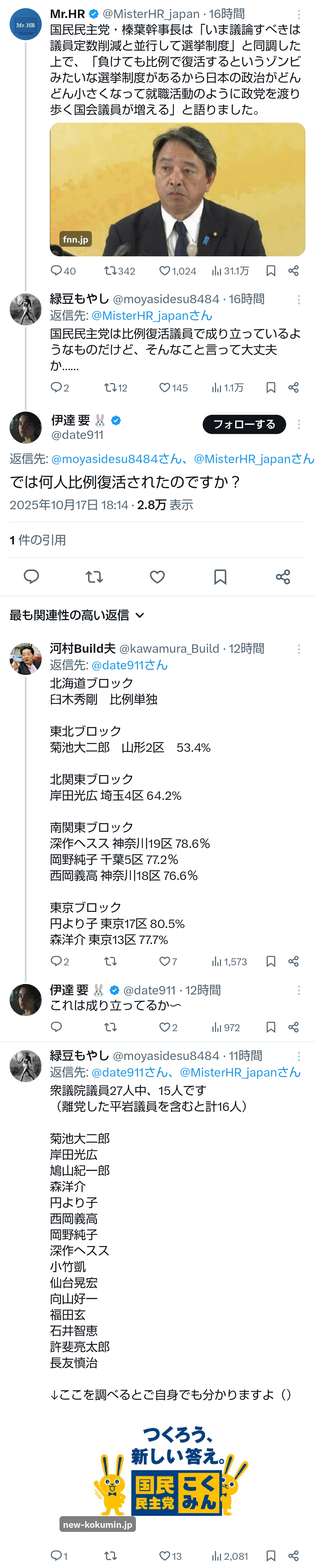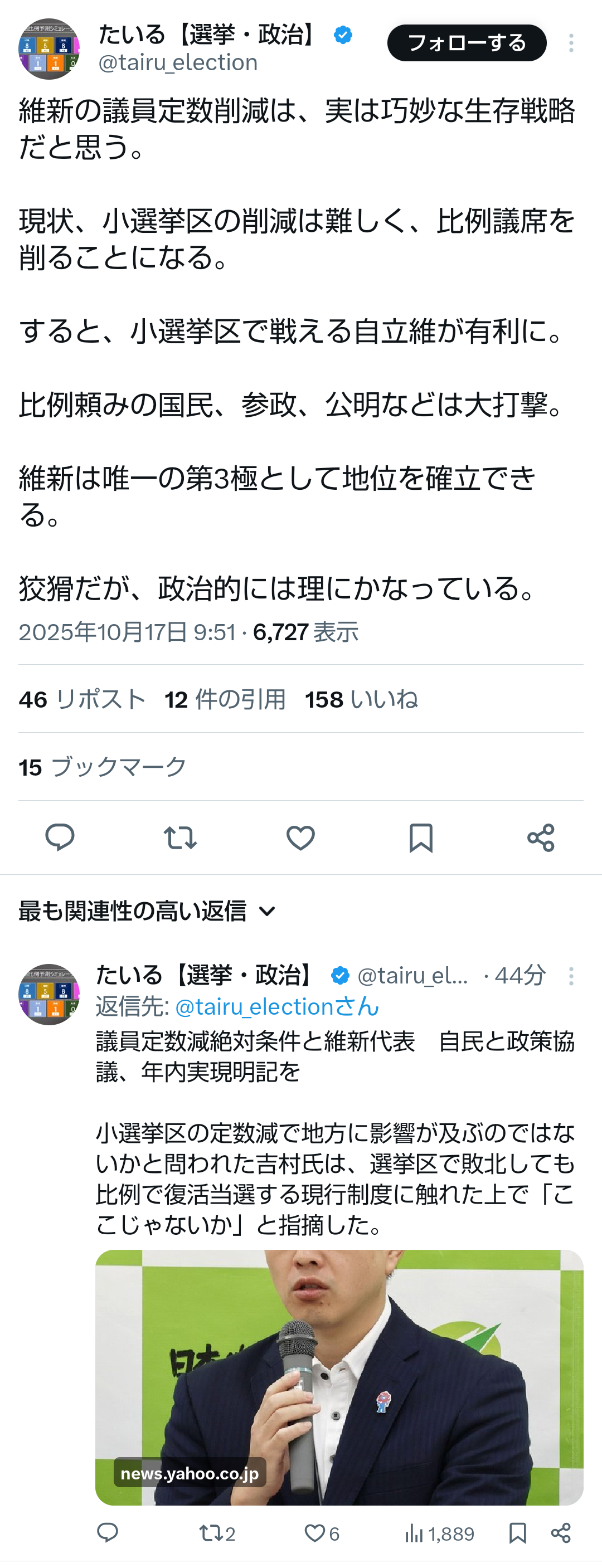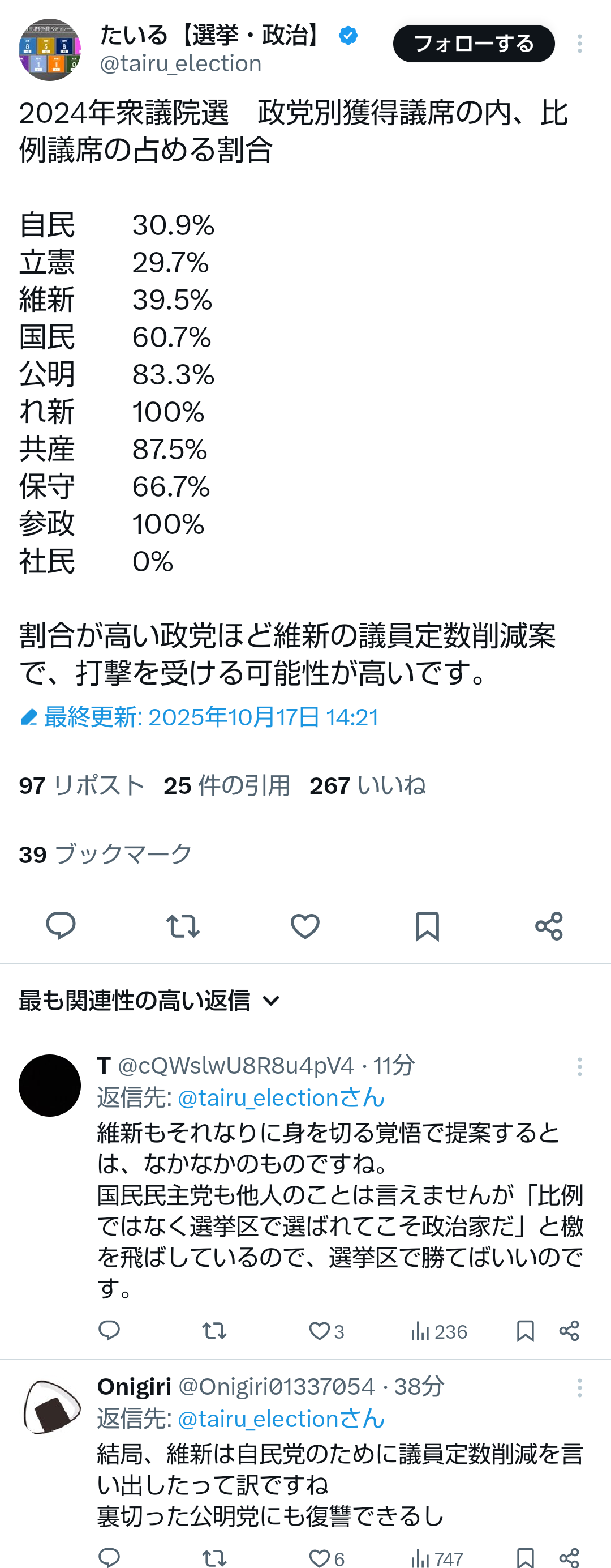 … | 694無題Name名無し 25/10/18(土)08:09:51No.753813+維新の協力条件の議員定数削減が比例の方らしいのは良かった |