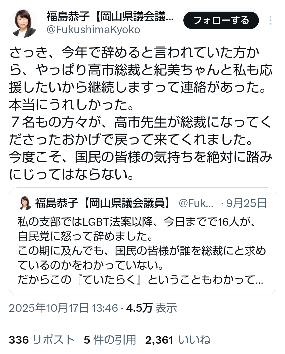 … | 700無題Name名無し 25/10/18(土)08:55:43No.753819+国民の為なら自分の党が犠牲になってもいいって覚悟を決めたって事だろう(すっとぼけ) |