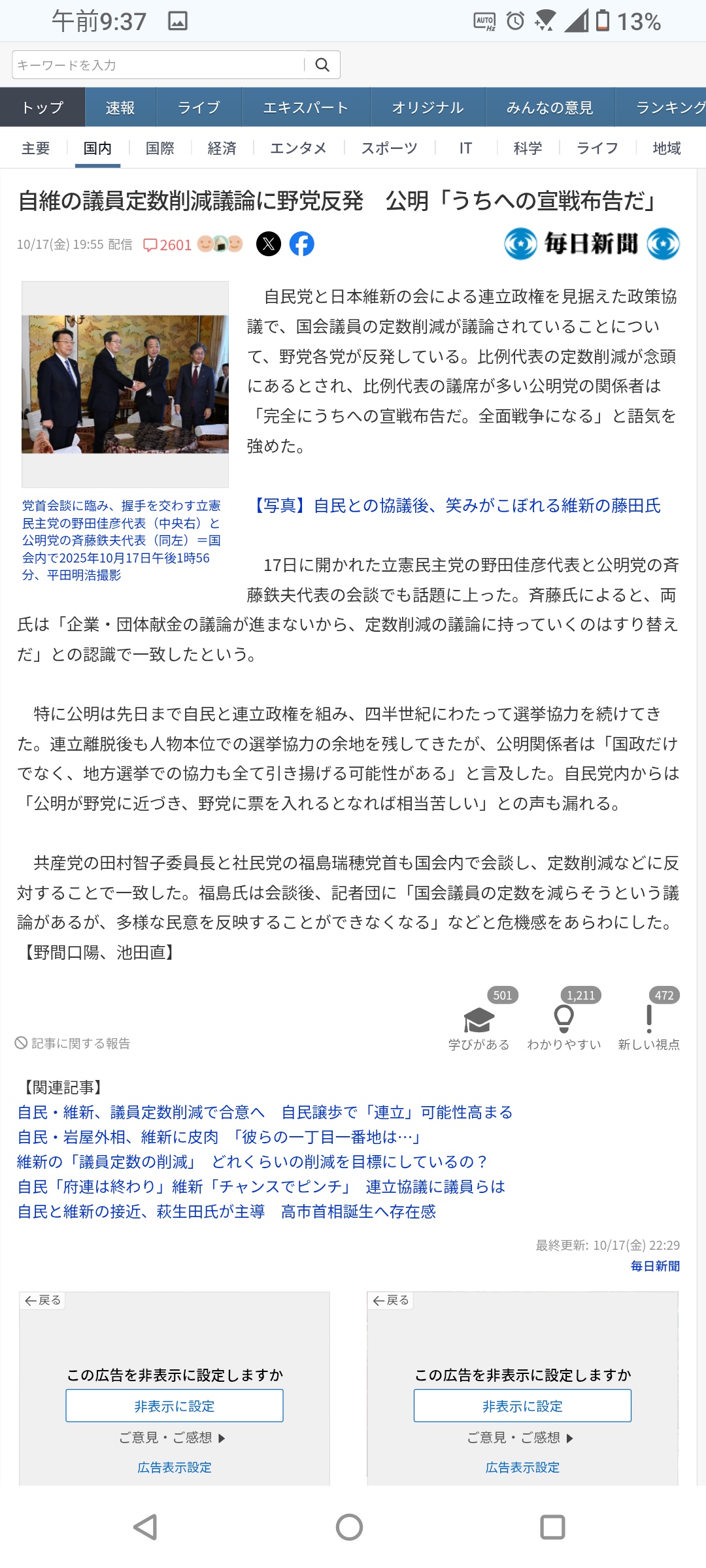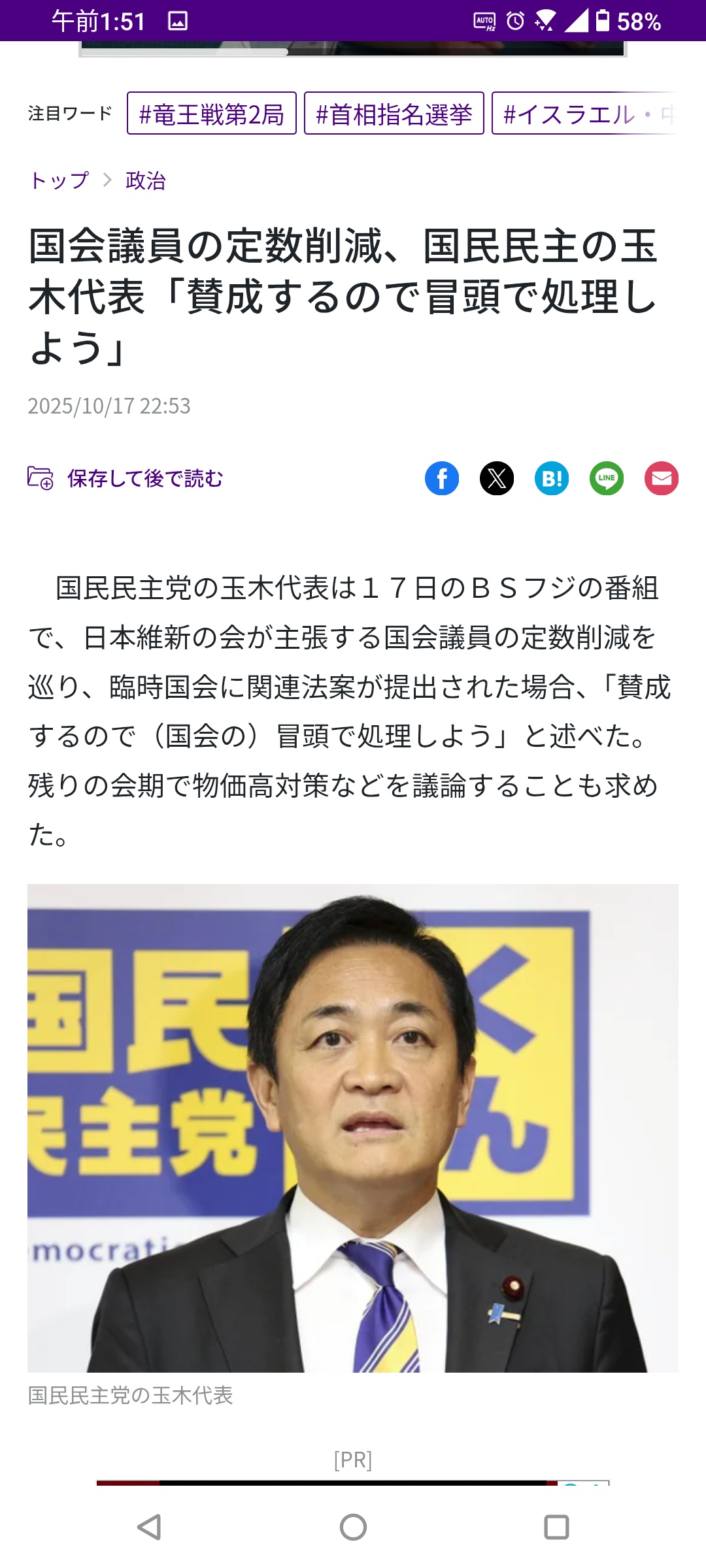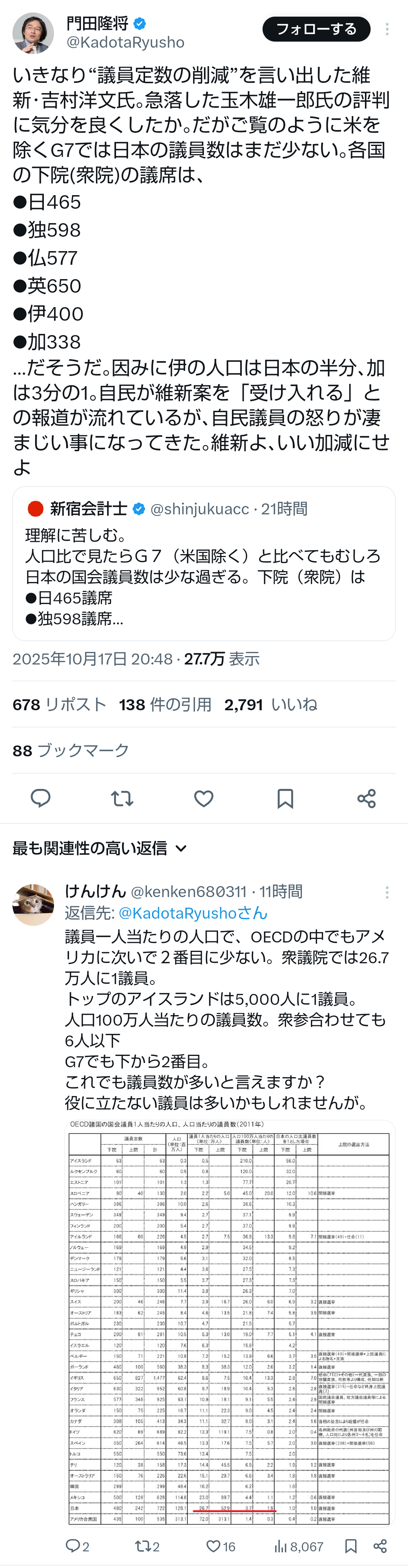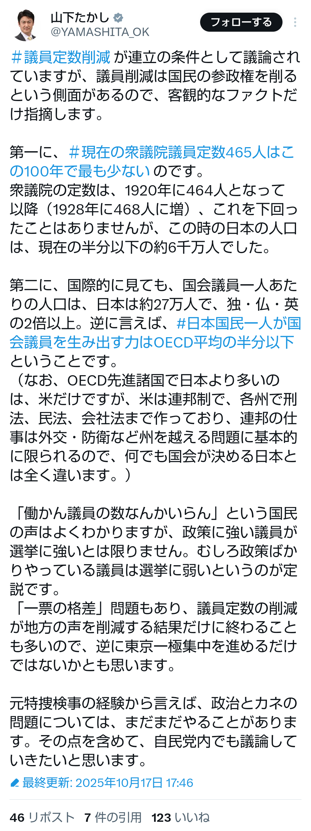 … | 770無題Name名無し 25/10/19(日)00:19:15No.753900そうだねx1衆院定数削減は実際に手掛けるのであればやりやすいと思うんだよね |