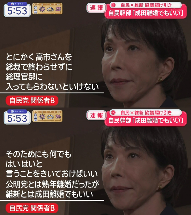 … | 769無題Name名無し 25/10/19(日)00:10:35No.753899+そのへん疑っていくと本当にキリがなくて維新も今回ぎりぎりで裏切る可能性が最後まで残るからとにかく高市さん総理にして解散総選挙して議員数ある程度回復させないといけないのよね |