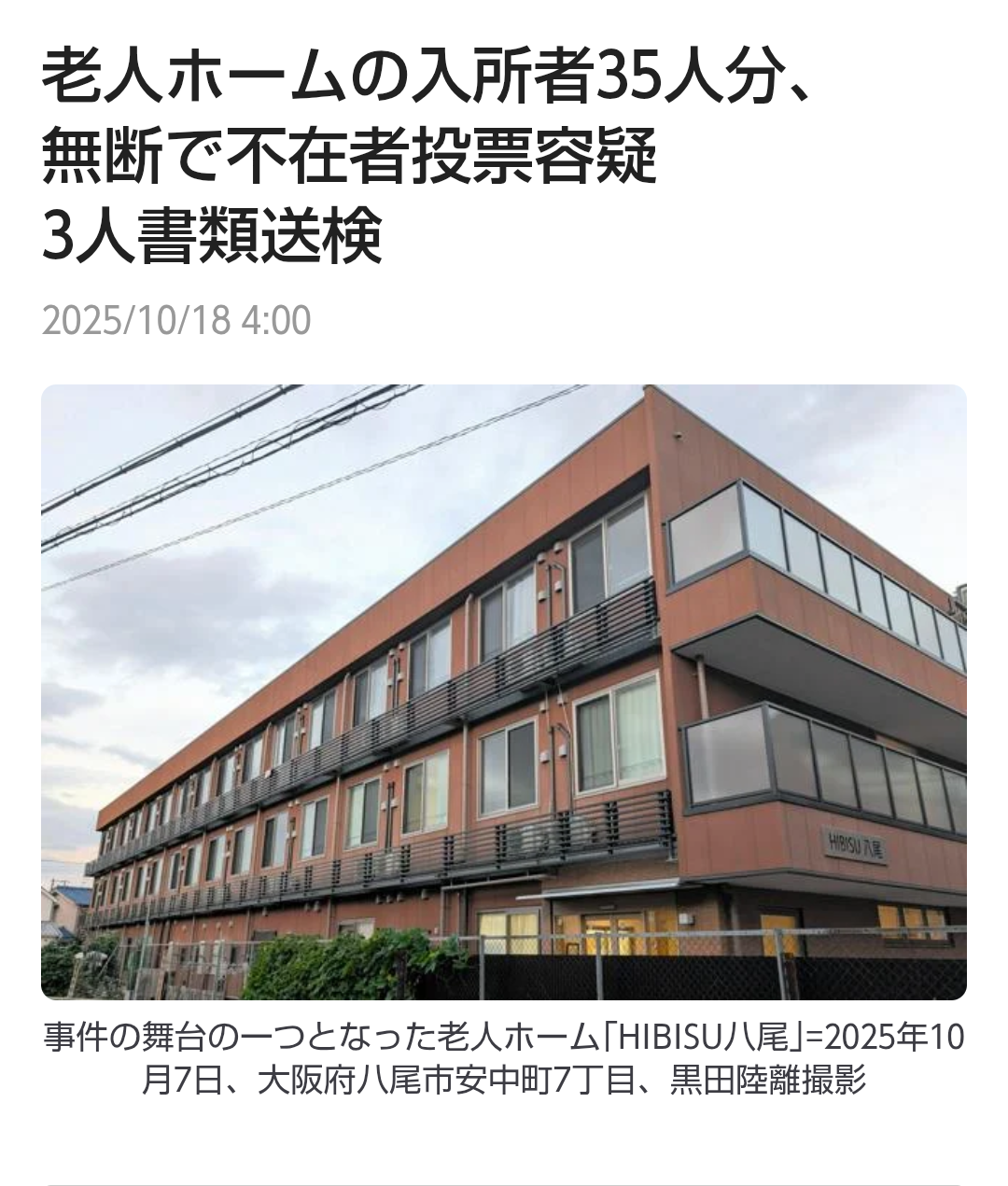 … | 704無題Name名無し 25/10/18(土)09:19:54No.753823そうだねx3 1760746794781.png-(950042 B) ![]() >老人ホームの入所者35人分、無断で不在者投票容疑 3人書類送検 |
