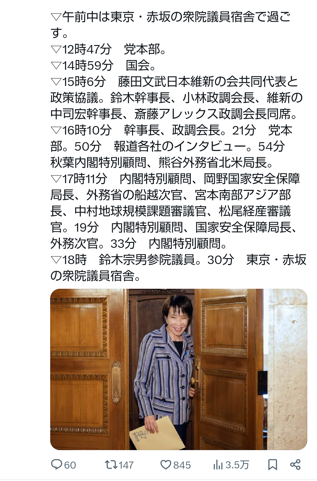… | 748無題Name名無し 25/10/18(土)18:43:20No.753876+>>実は総裁選勝利した日にすぐに会ってたりする |